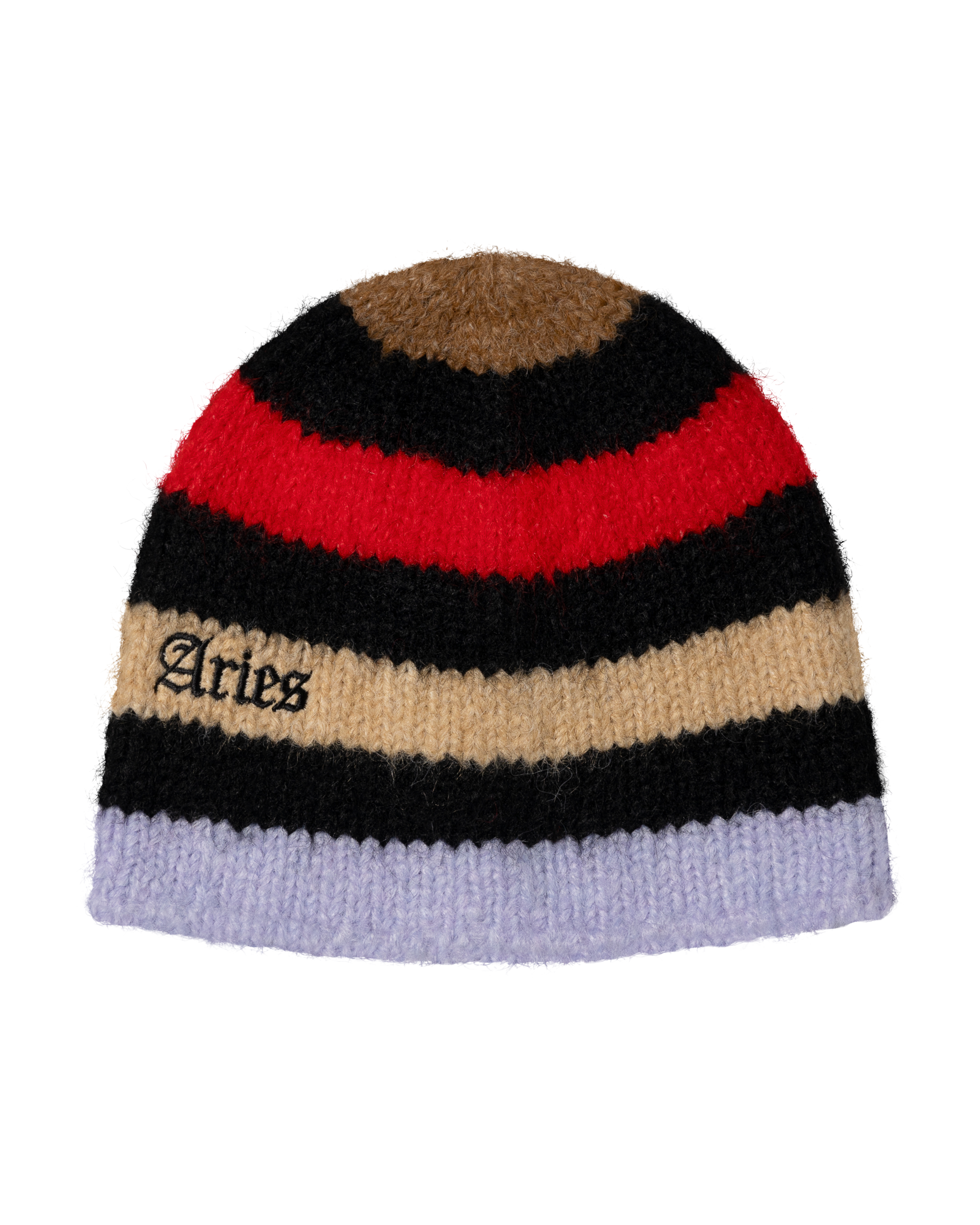 Brushed stripe knit, fold back beanie with embroidered Gothic Aries logo.
