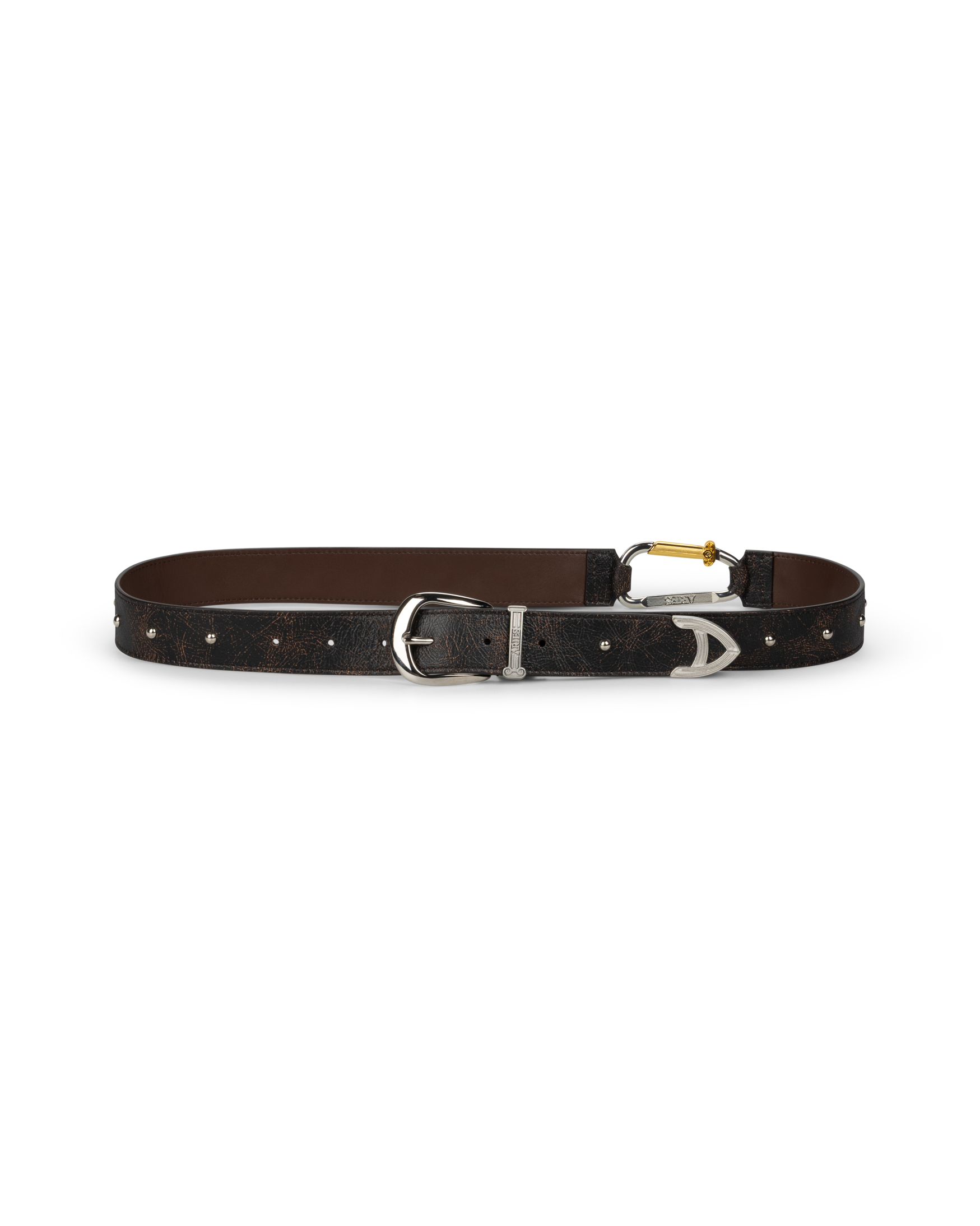 Made from 100% cow leather with a vintage finish. Features the Aries metal column belt loop, Aries carabiner fastening, and aluminium hardware.