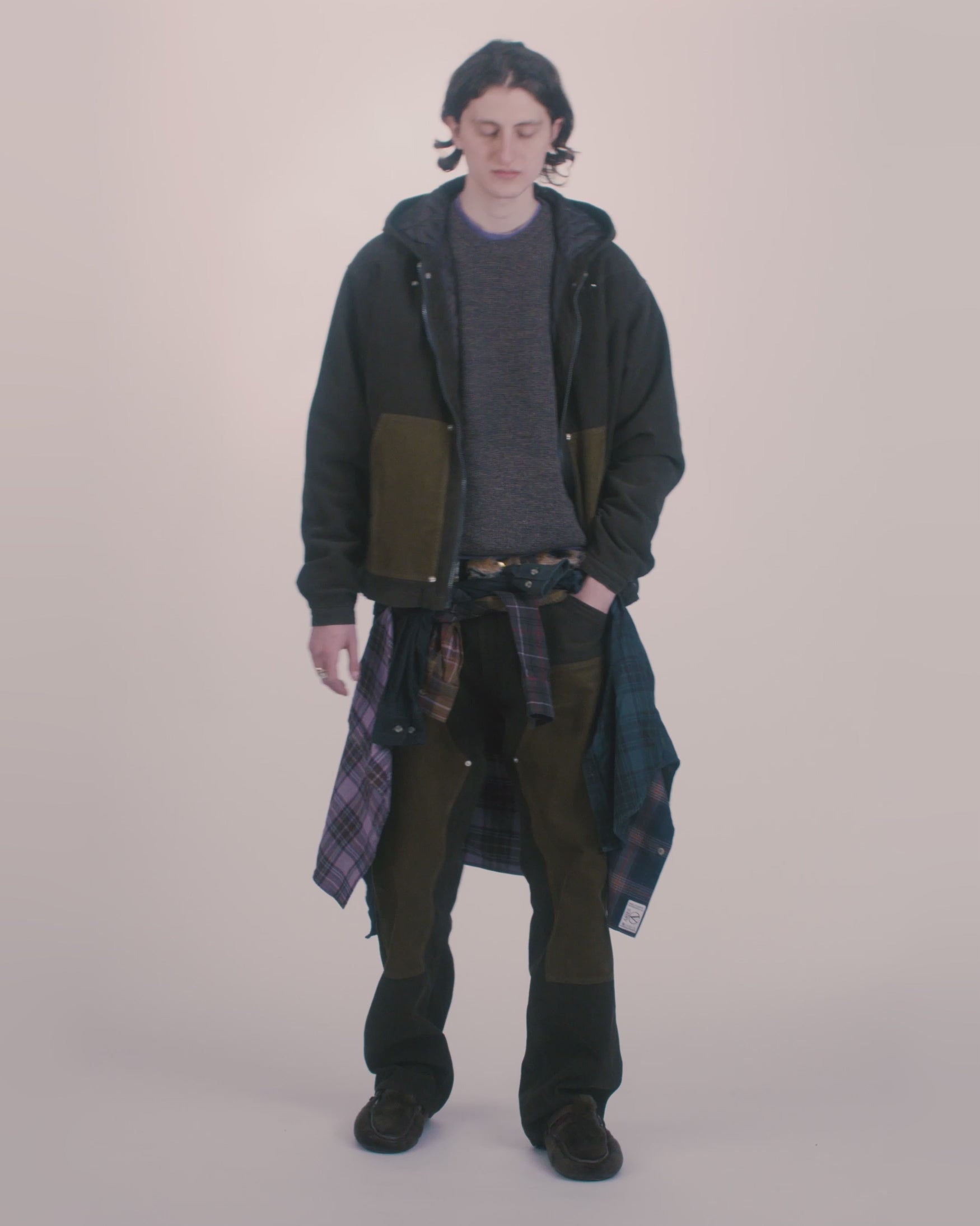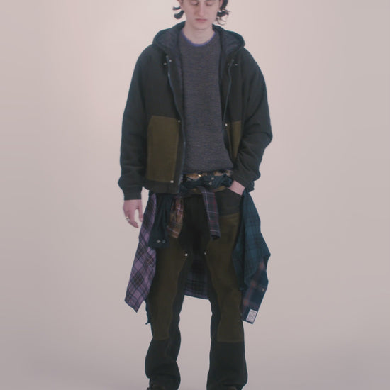 Unisex carpenter corduroy trousers with western details and contrast panels. Made from 100% cotton corduroy, colour blocked and overdyed, with rivet detailing.