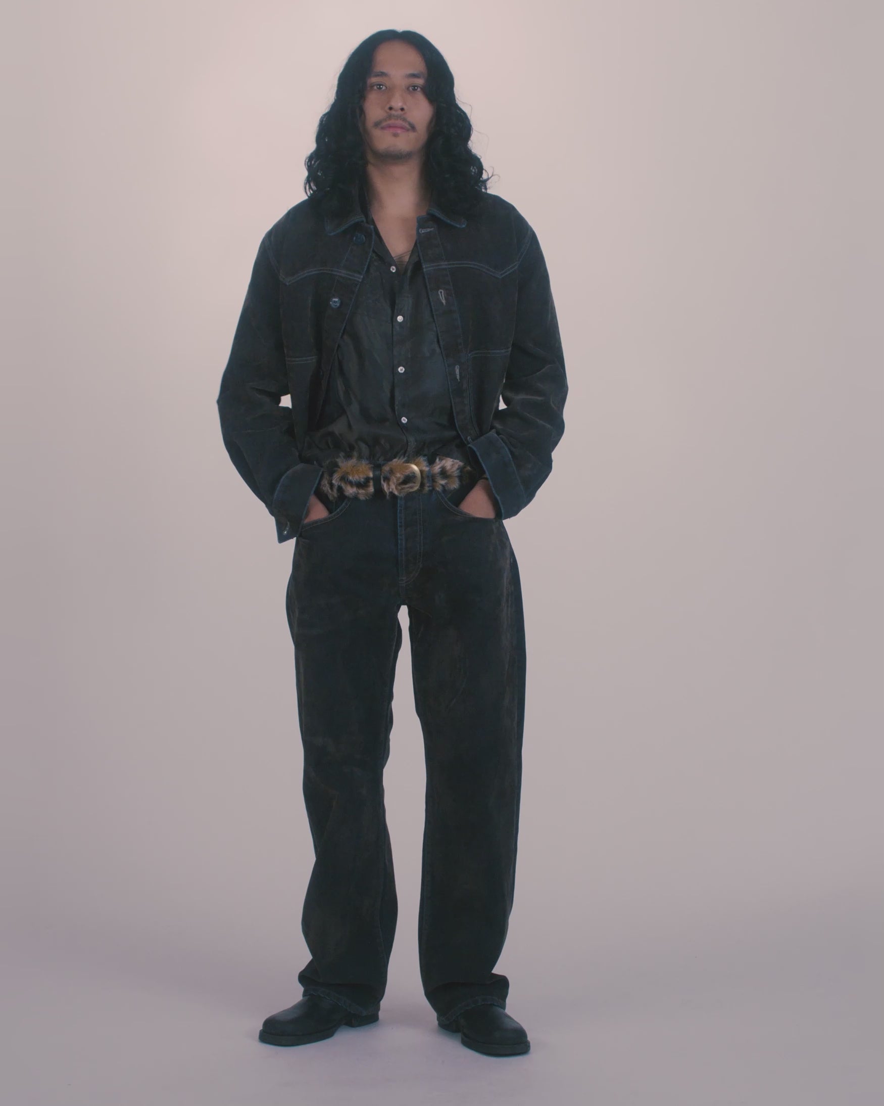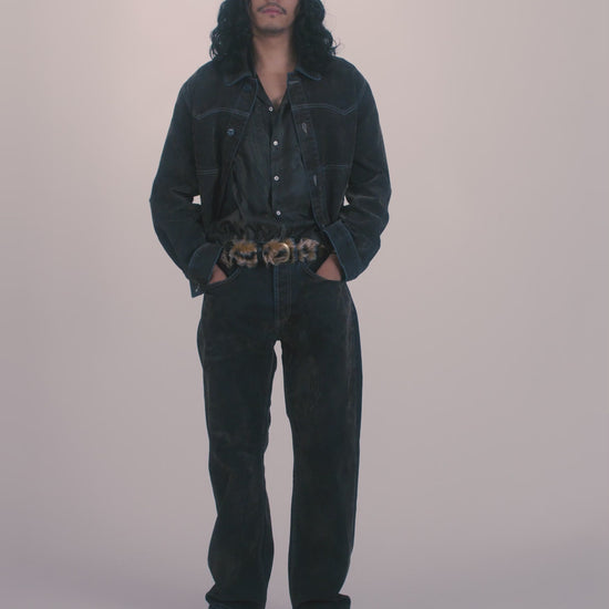 Unisex classic straight leg Batten Jean in blue denim with green flocking on top with a heavy wash. Lasered Aries temple branding behind back pocket and leather denim patch. 100% cotton.