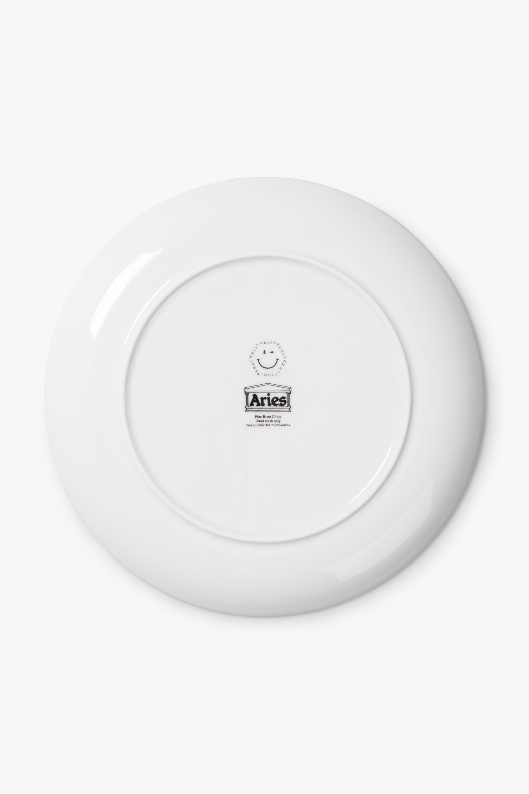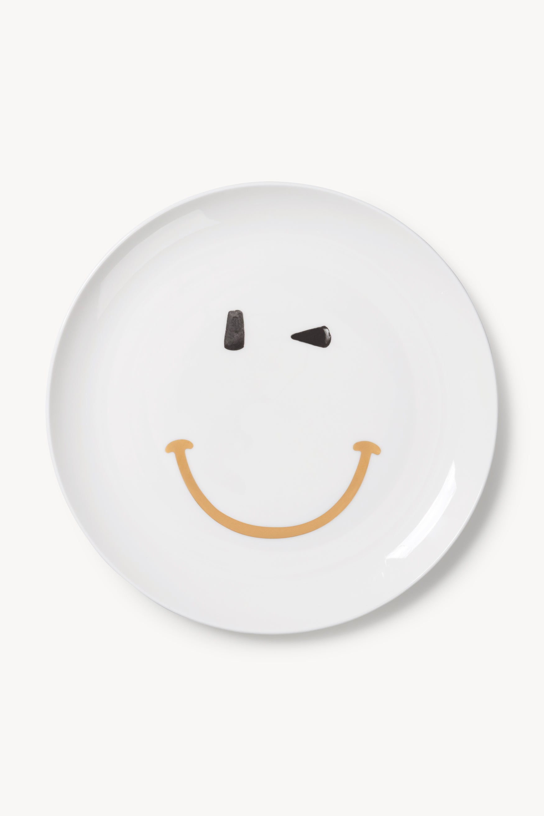 Jeremy Deller x Aries large bone china plate approximately 270mm diameter with Smiley graphic in gold leaf and black. Jeremy Deller x Aries tableware collection consists of plates and mugs that display graphics inspired by Stonehenge and Neolithic sites surrounding Wiltshire.