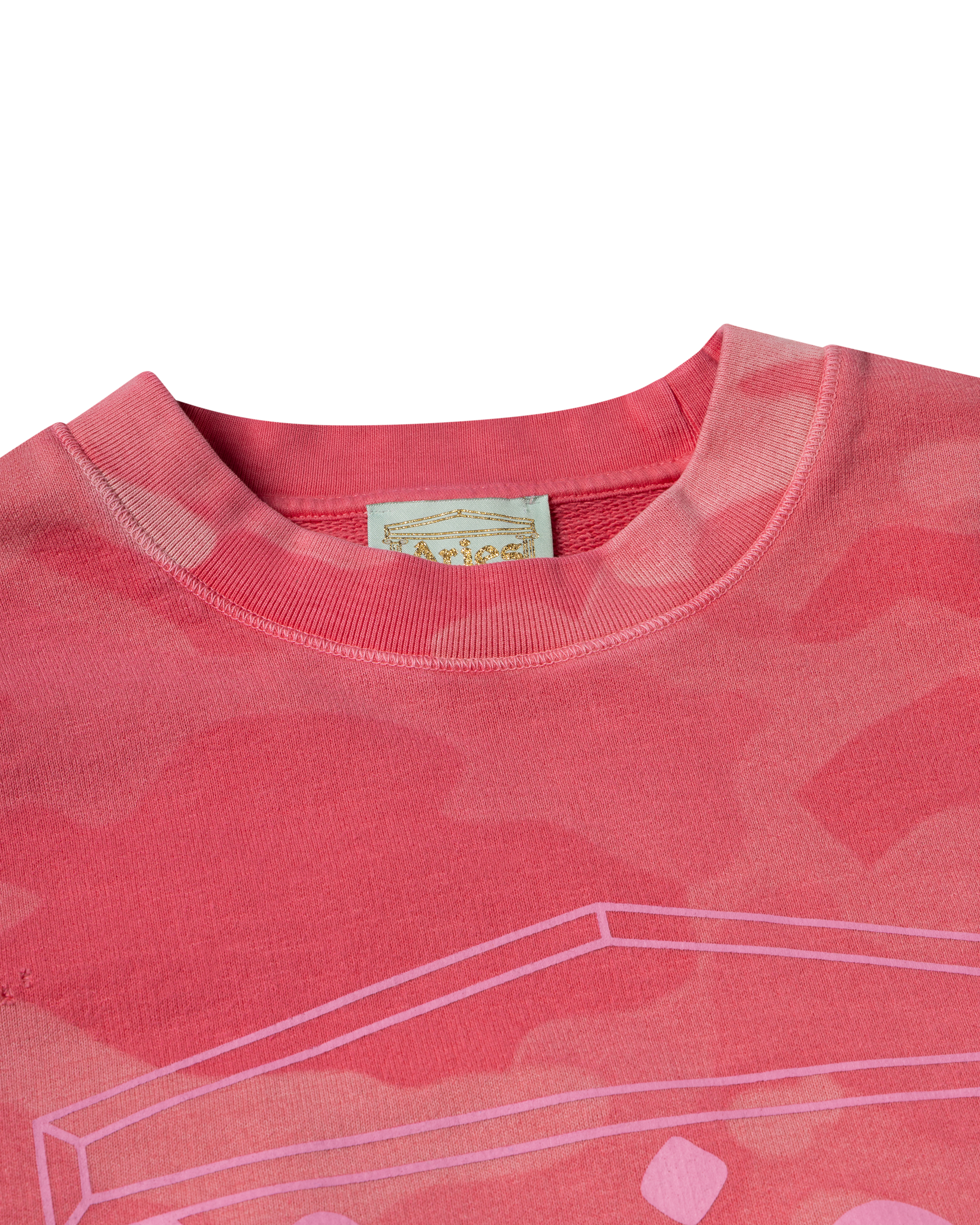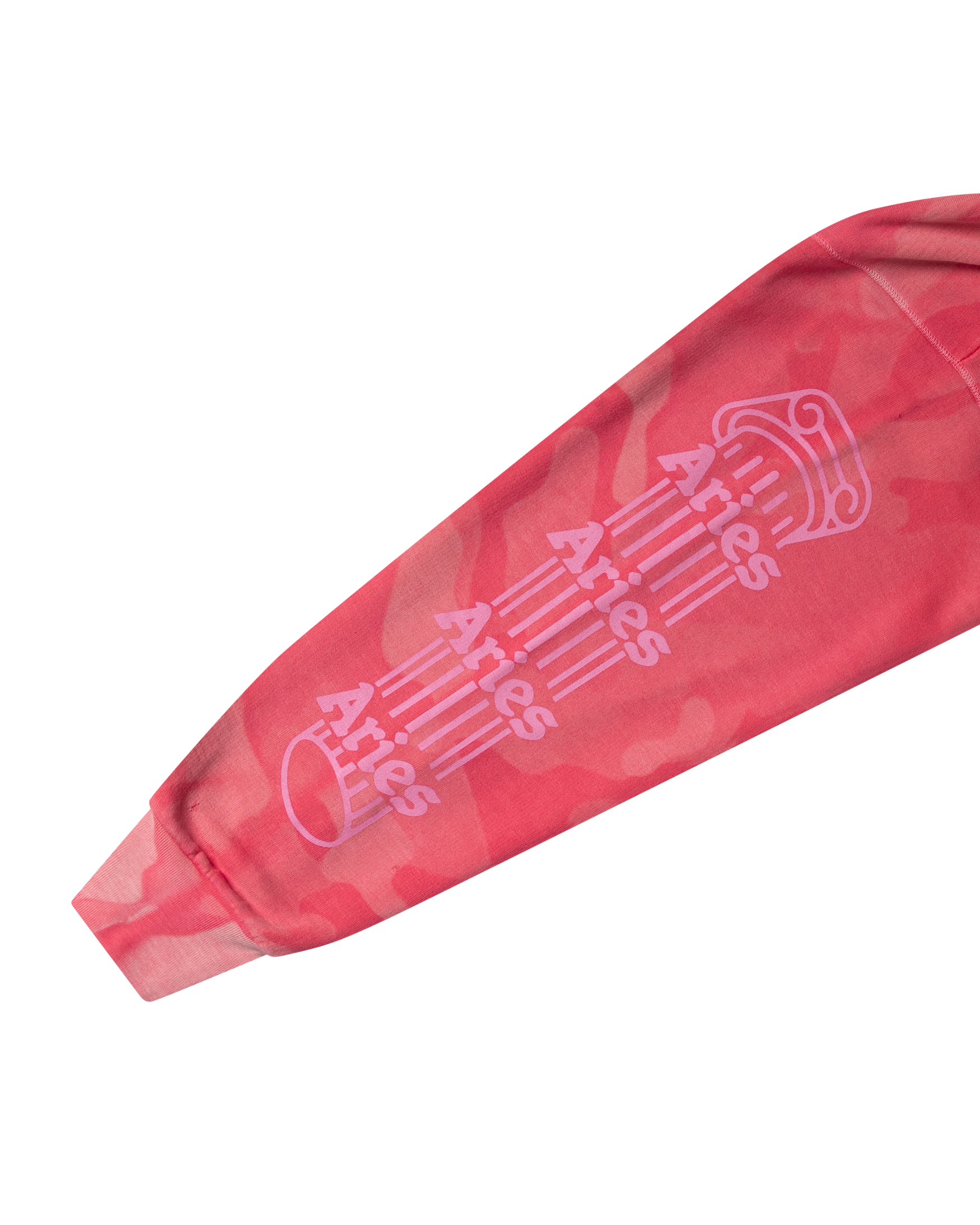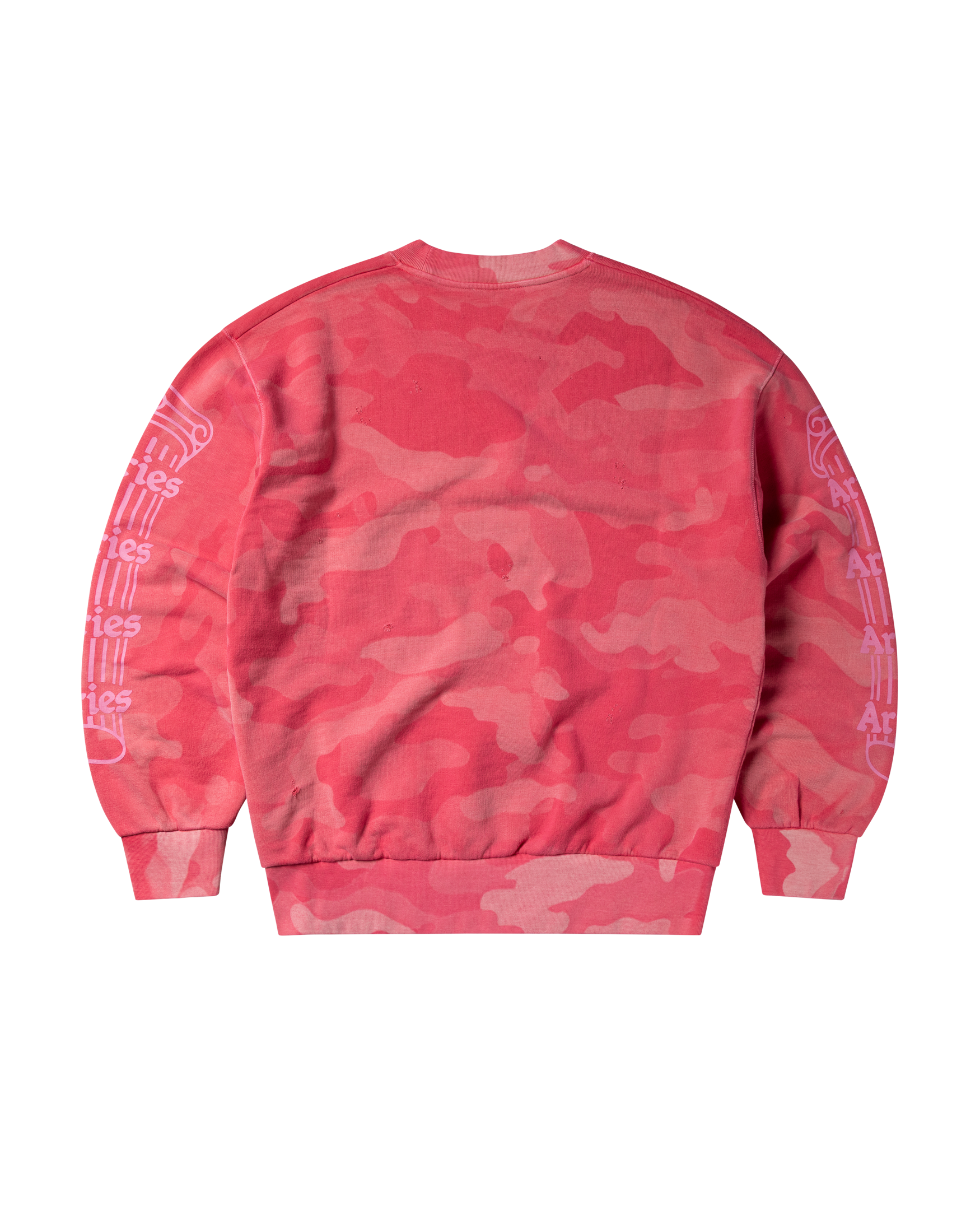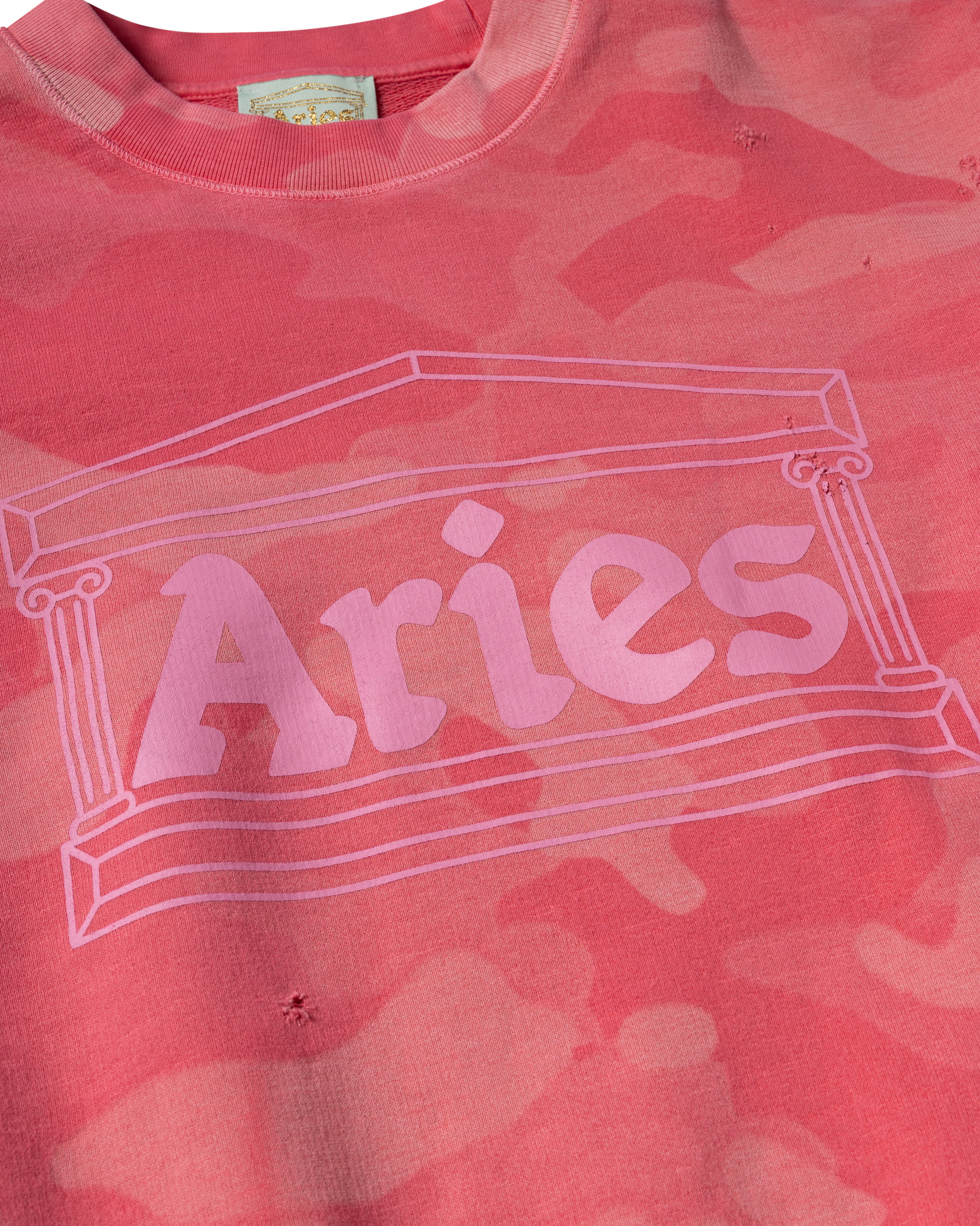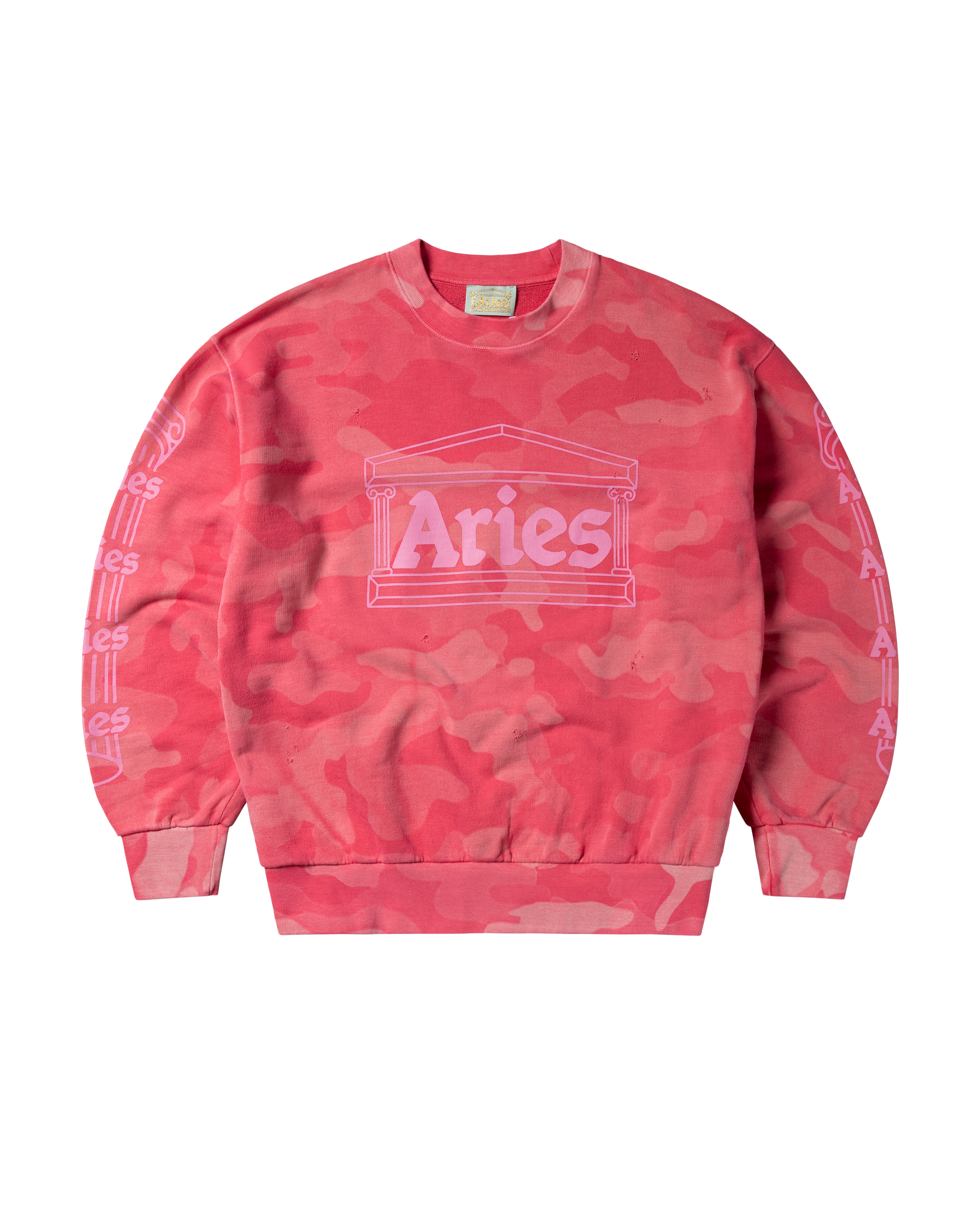 Unisex sweatshirt made from loop-back 100% cotton jersey fleece. With a camo laser treatment and screen-printed Aries Classic Temple on the front and Aries Classic Columns on the sleeves. Destroyed with a heavy wash treatment for an aged look.