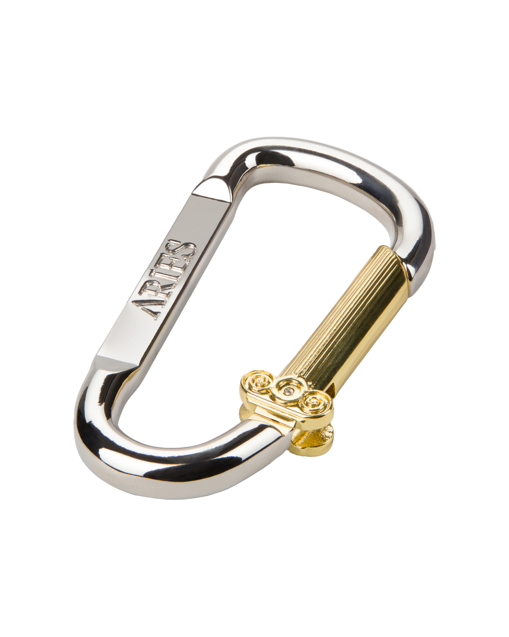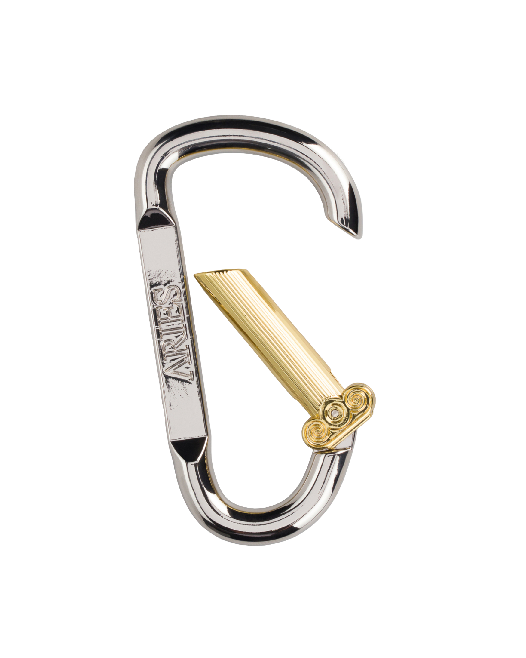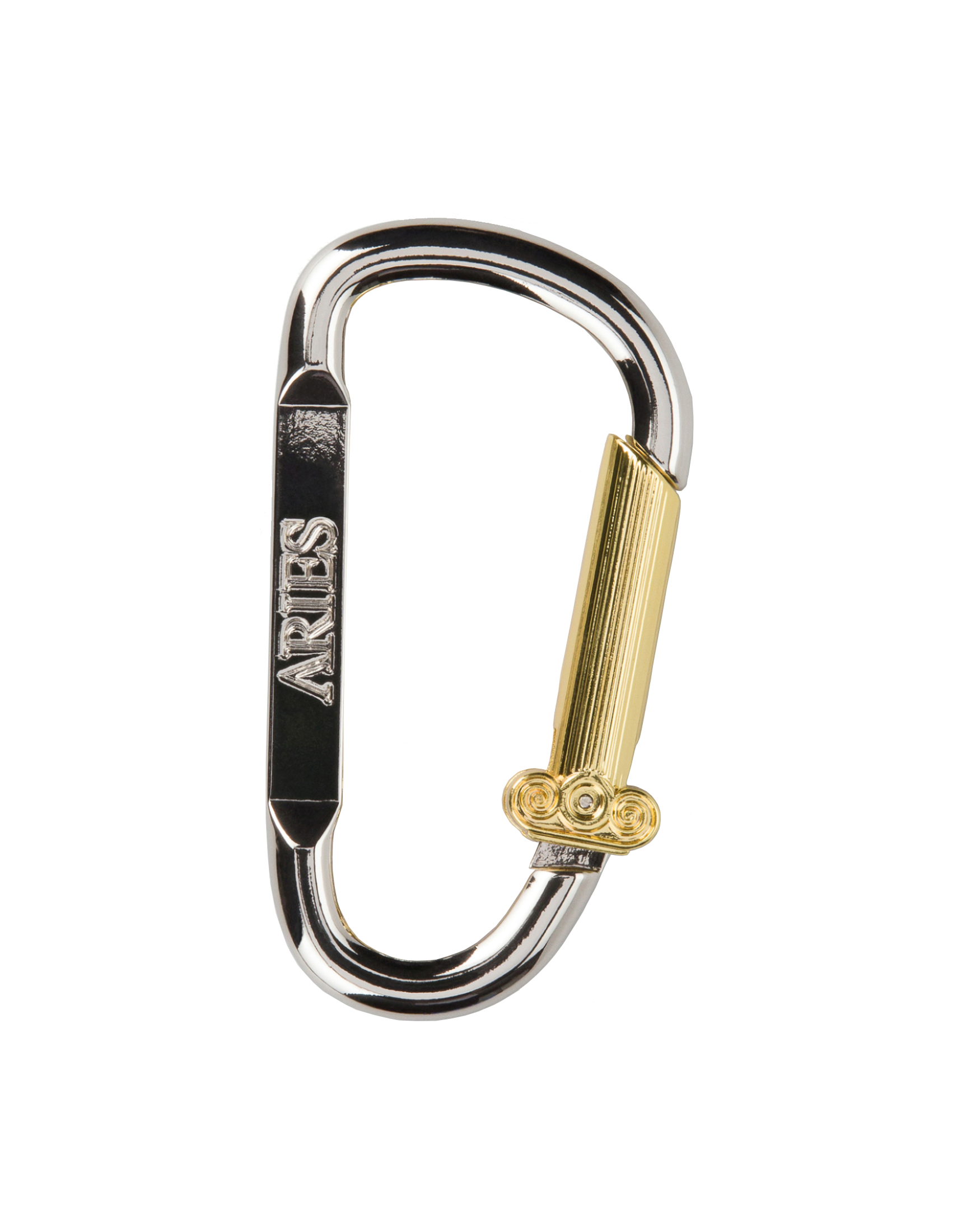Moulded brass - Silver and gold plated with moulded Aries carabiner as the clip - not for climbing.