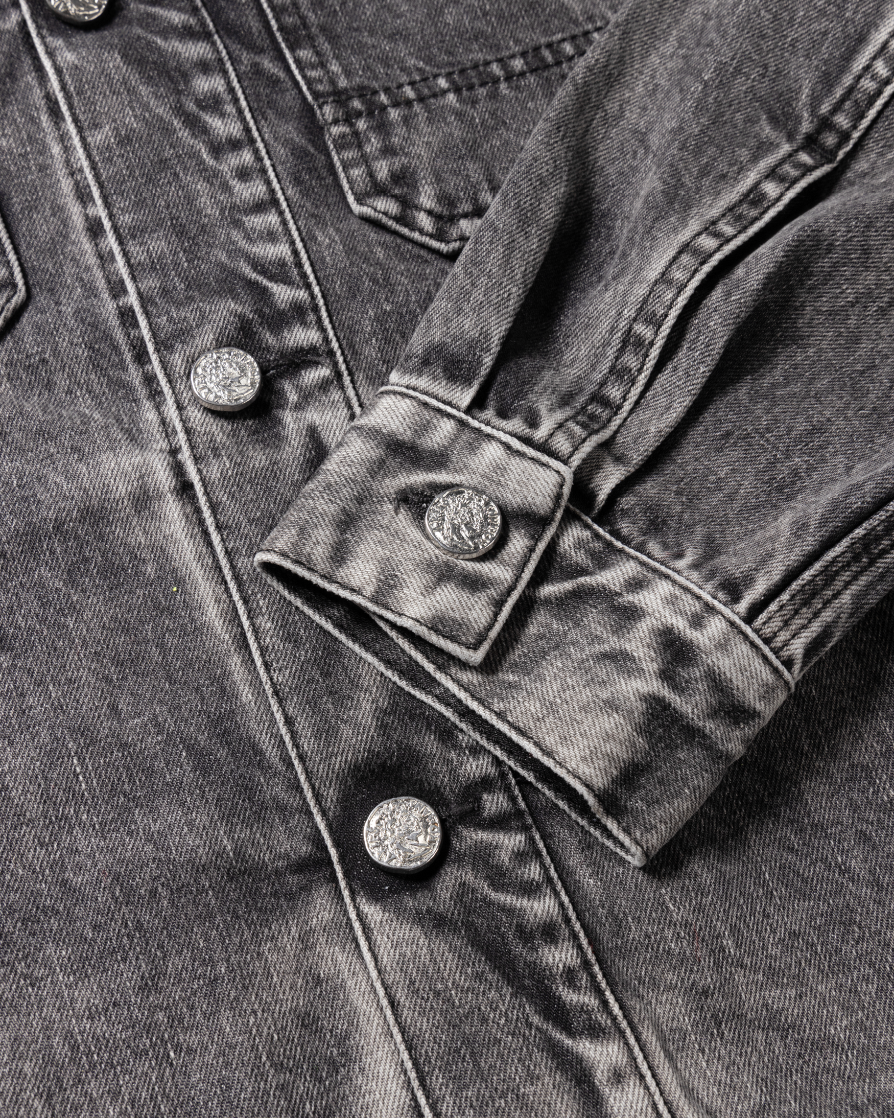 Unisex work jacket made from premium black denim, with custom Aries jeans buttons down the front, patch chest pockets and lower pockets inserted into a seam. Treated with an acid wash.