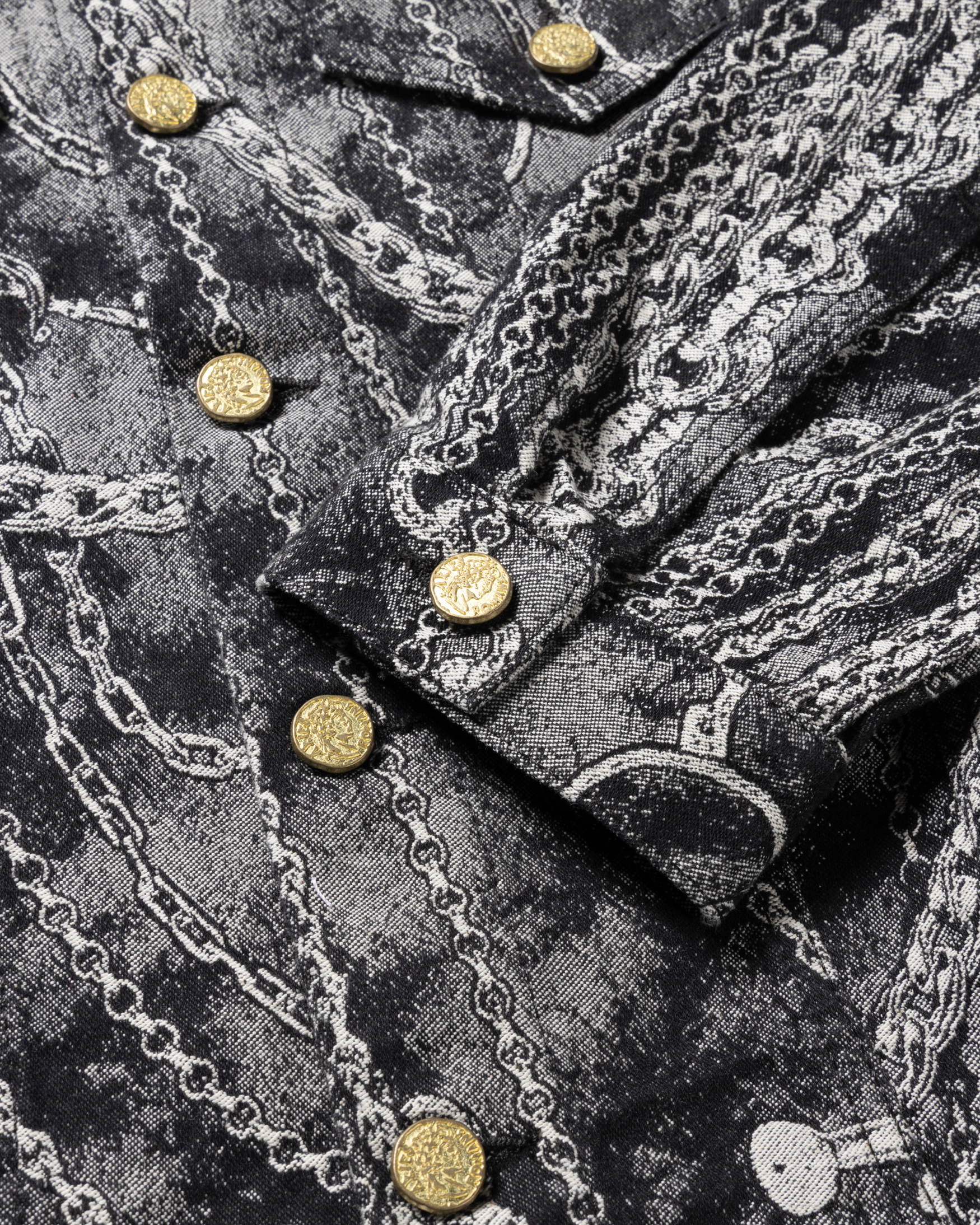 Unisex trucker-style jean jacket made from jacquard denim featuring a custom hanging chain and buckle design.