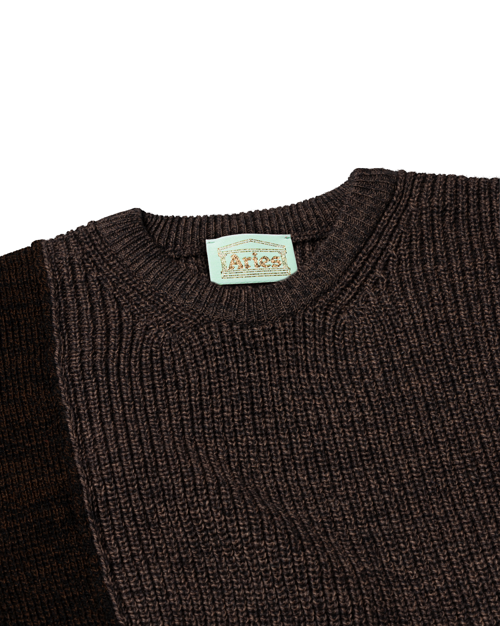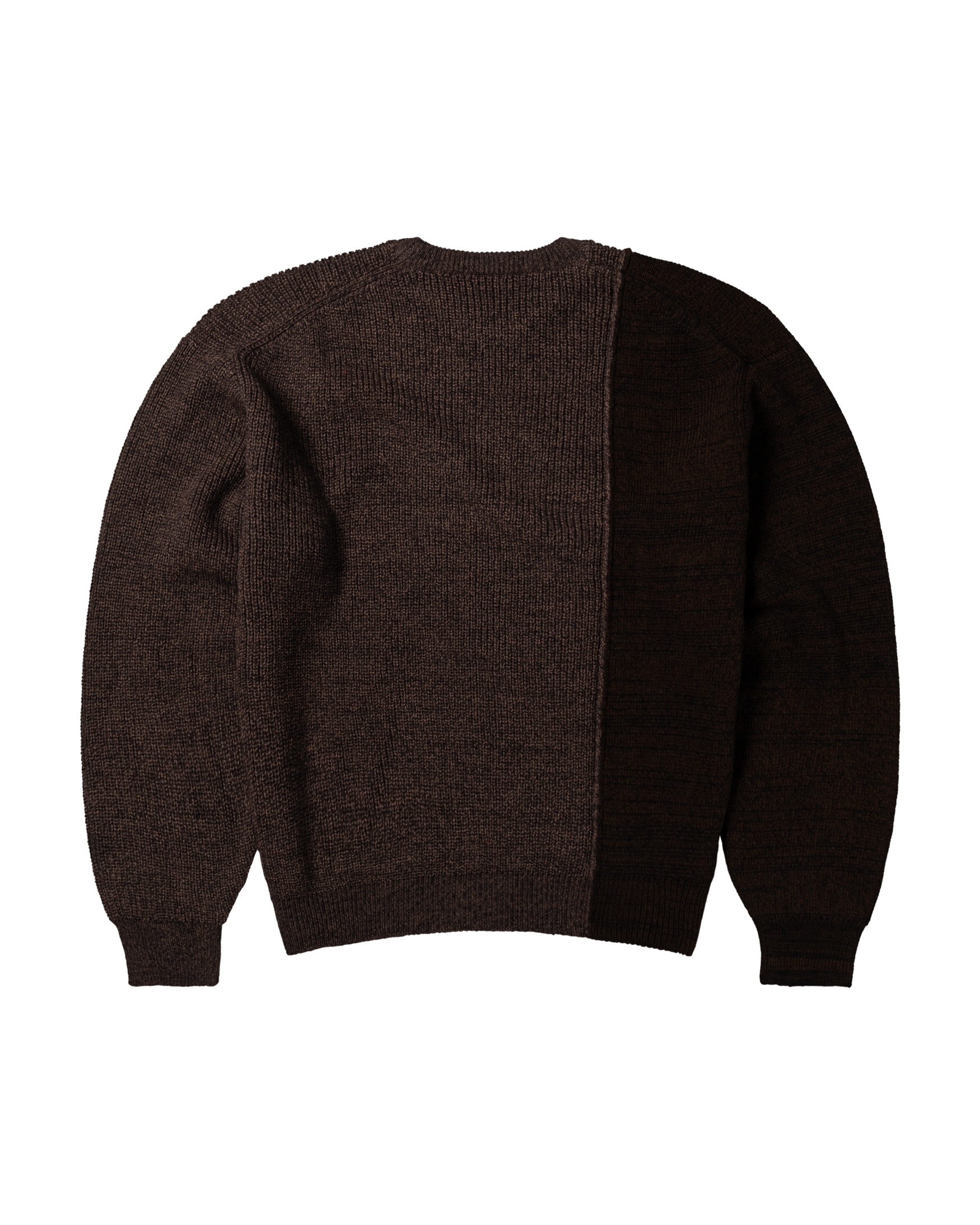 bi-colour crew neck sweater, with half milano and half cardigan panels. made with a wool blend.