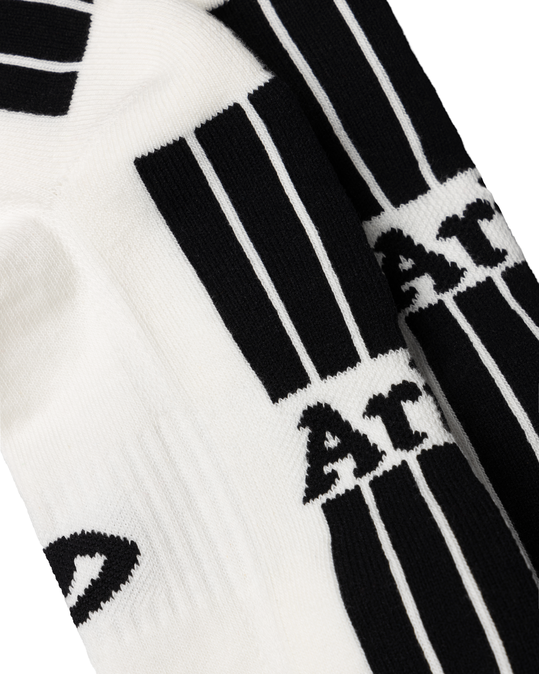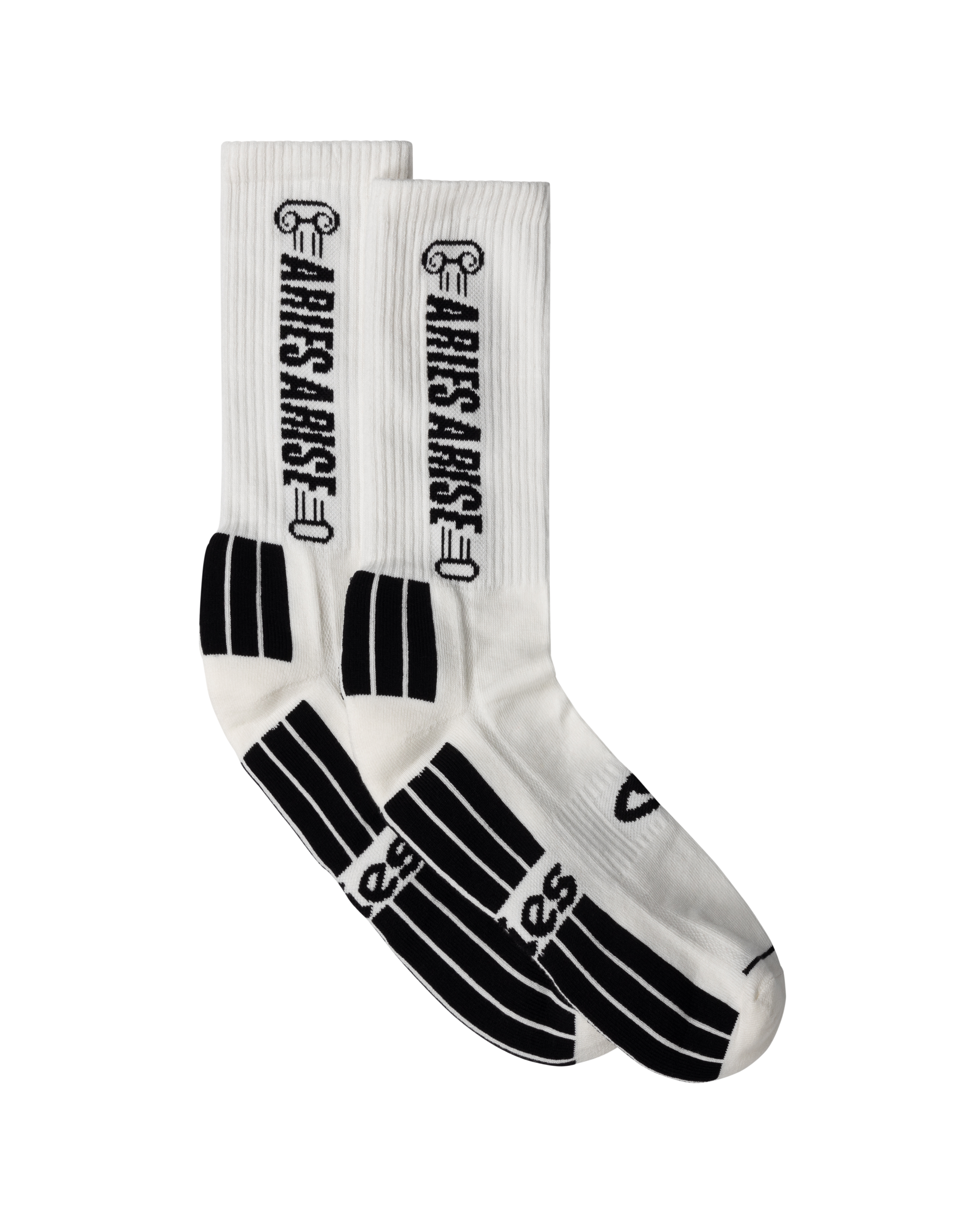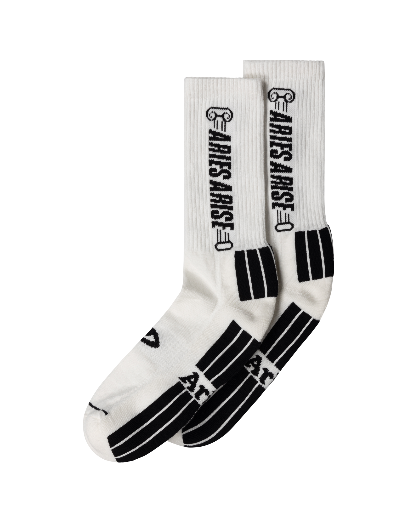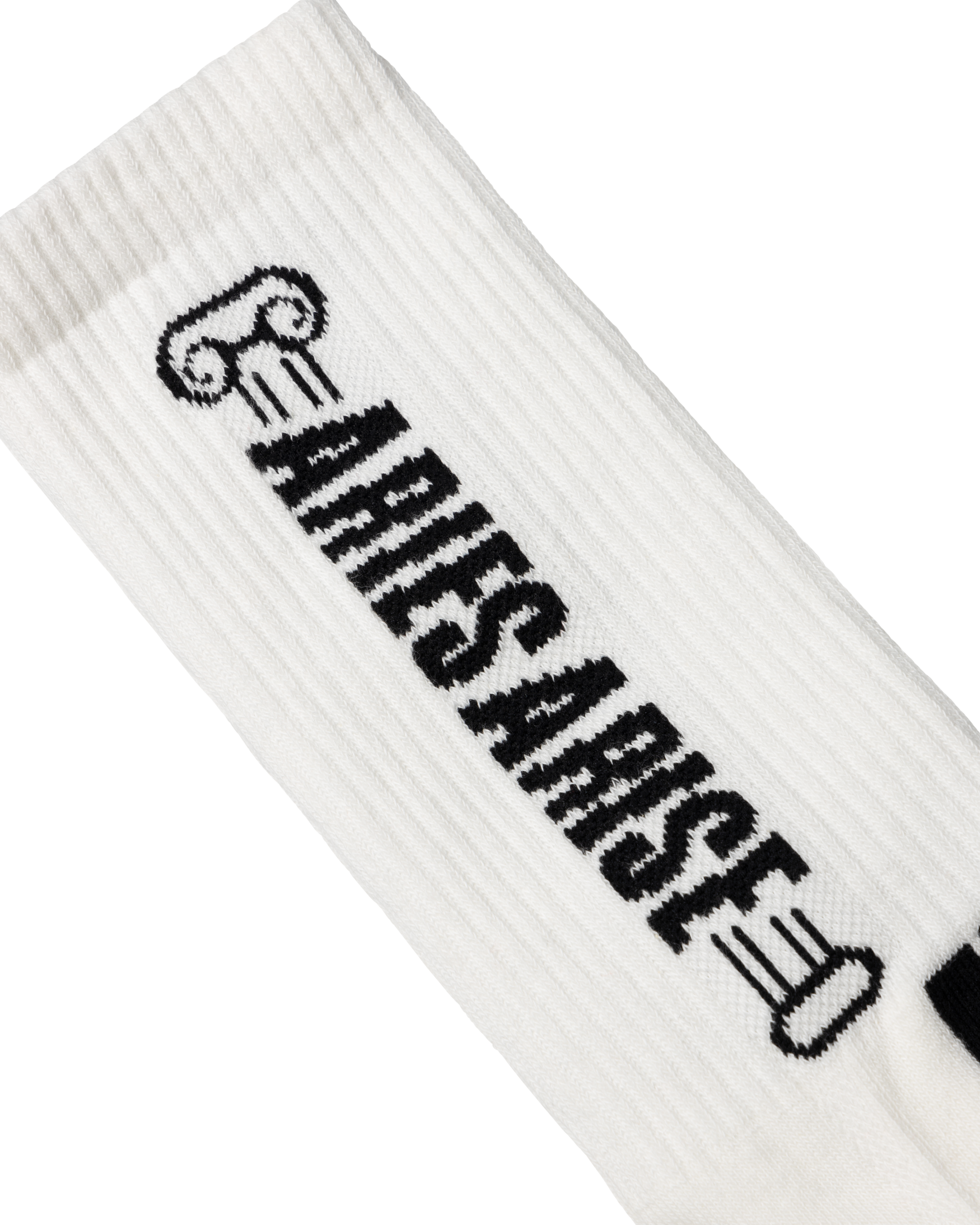Jacquard socks in a sports-blend mix yarn, with new Press Gothic Aries Arise Column graphic.