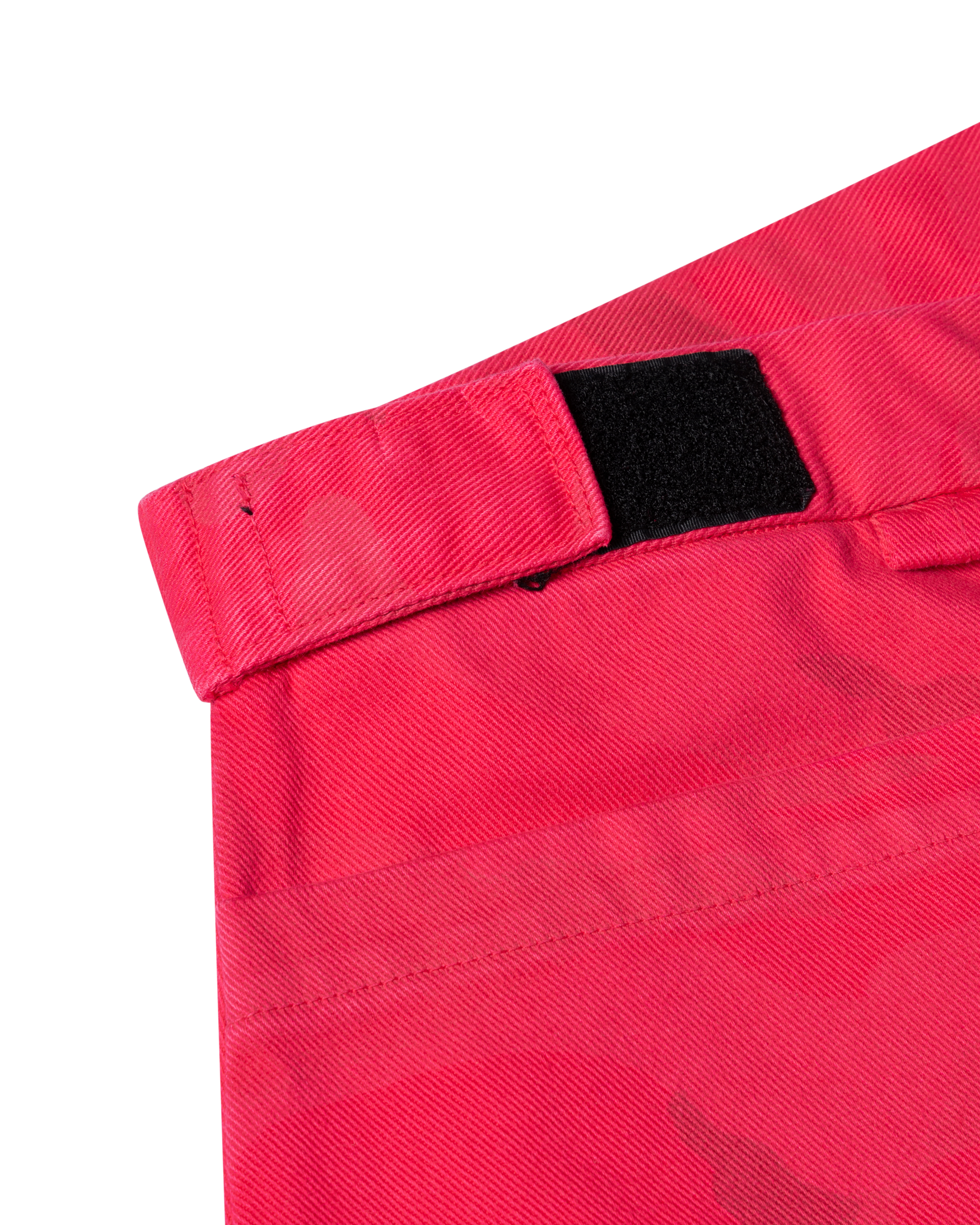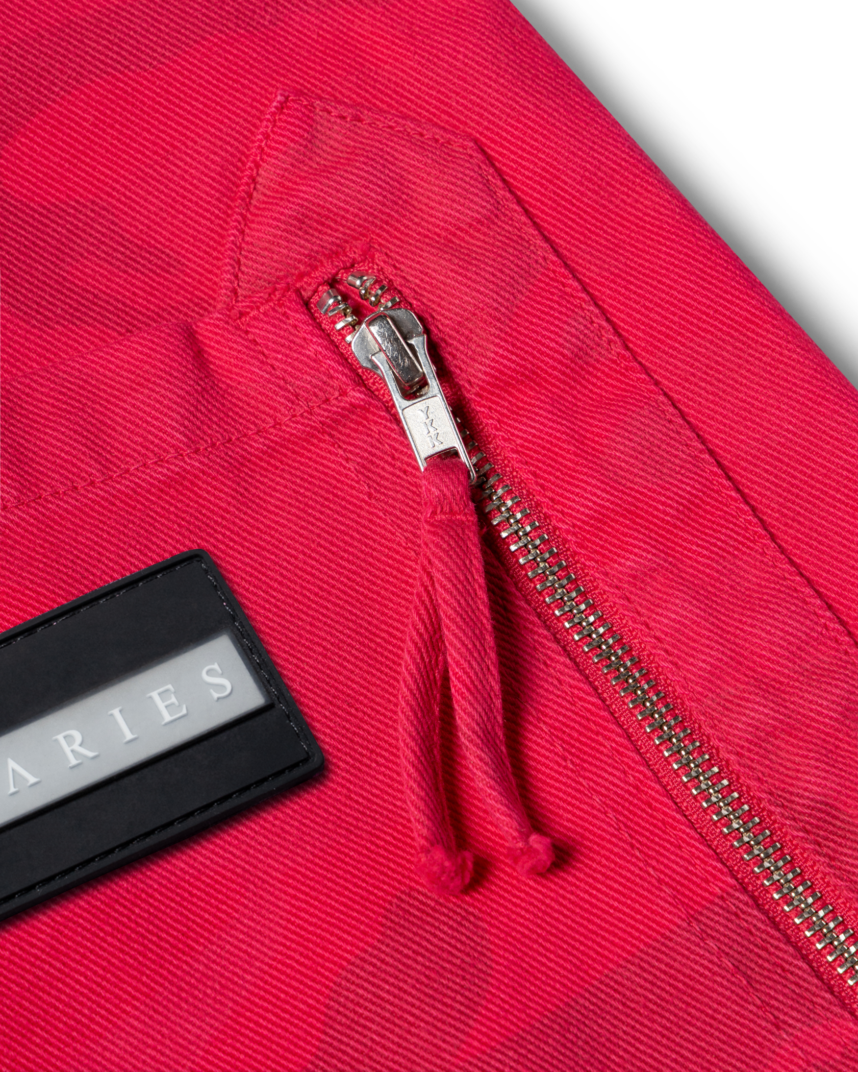 Camo printed, cotton canvas walking-style trousers with an over-dye treatment. Chunky contrast front zip, velcro side tabs to adjust the waist and zipped side pockets. With Aries silicone patch branding.