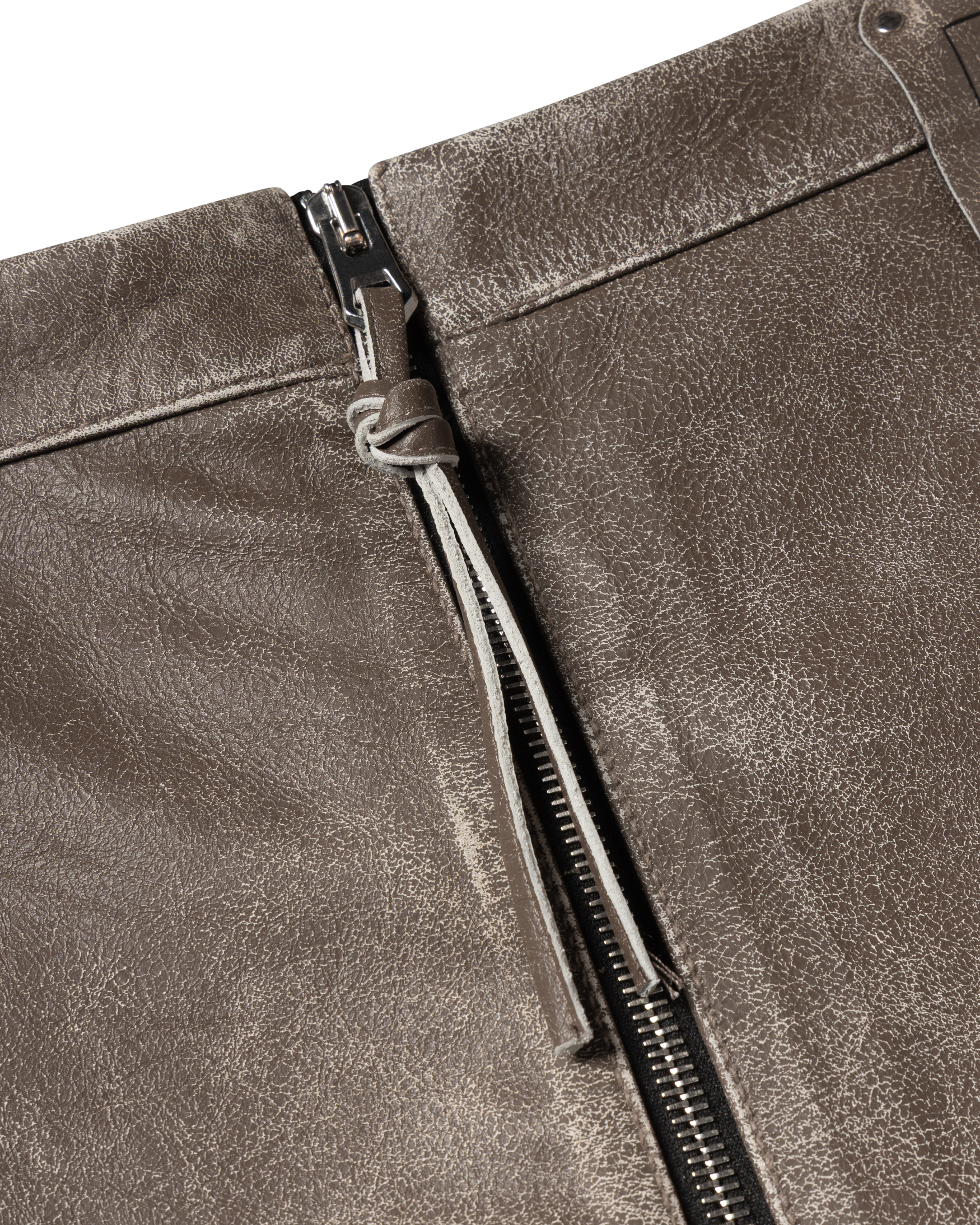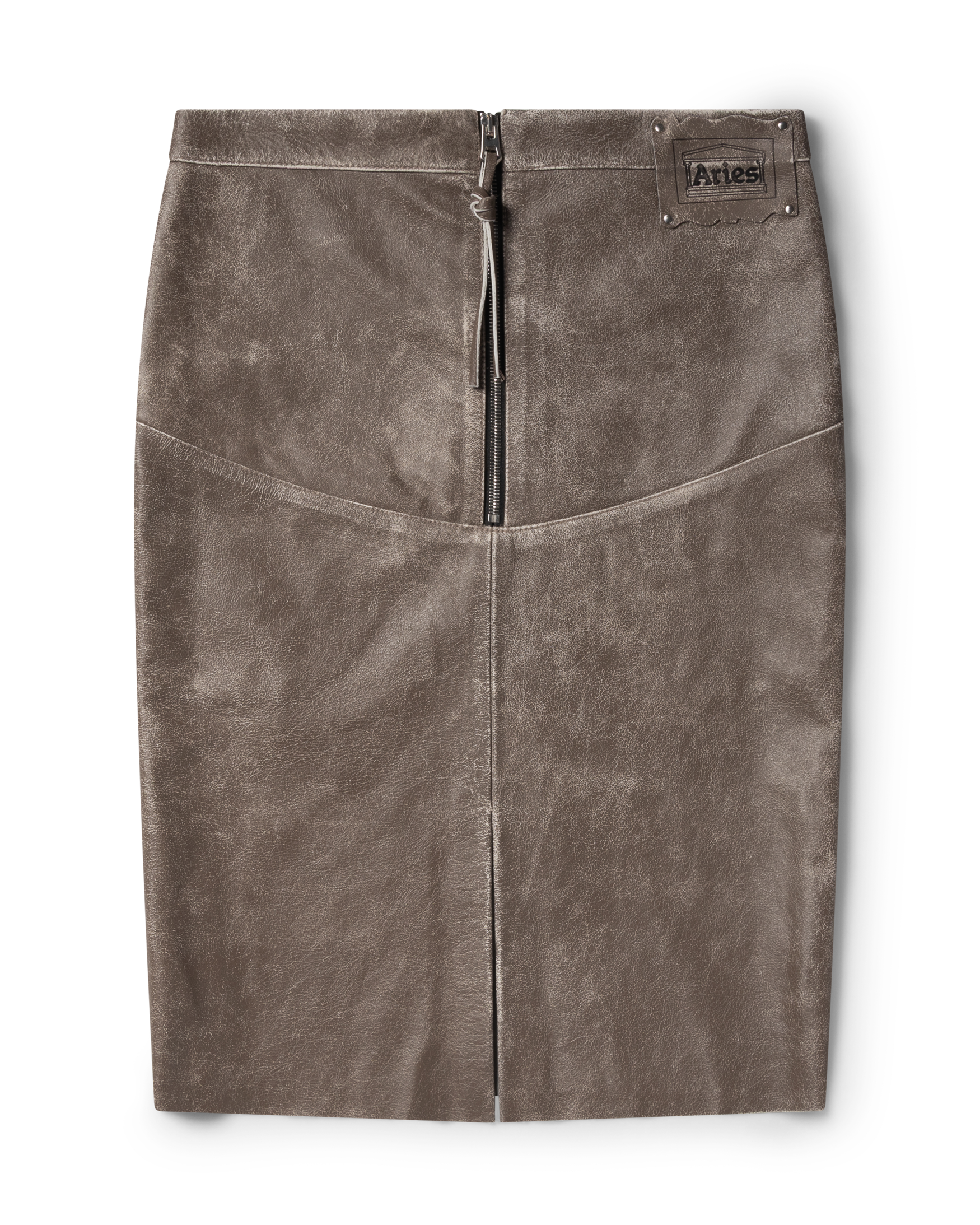 Mid-length pencil skirt in a distressed leather with panel detailing and an exposed centre back, zip-lined in black polyester. Featuring an embossed Aries Temple leather patch.
