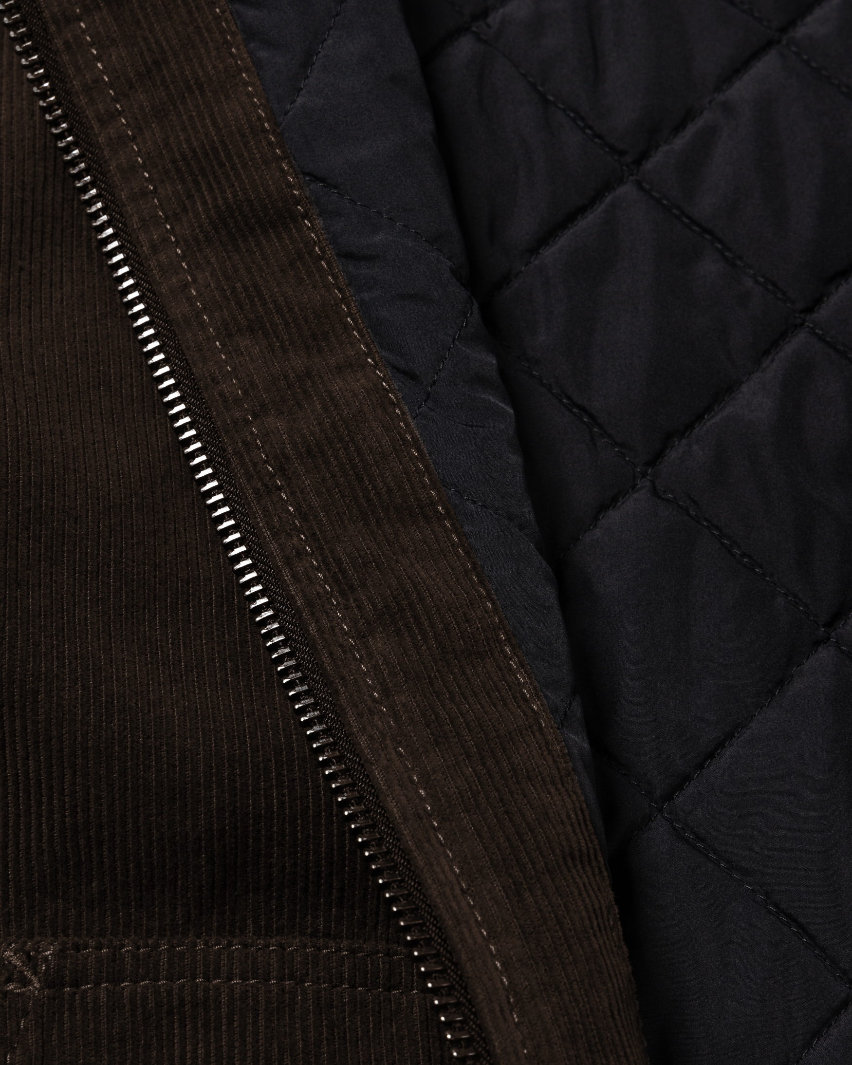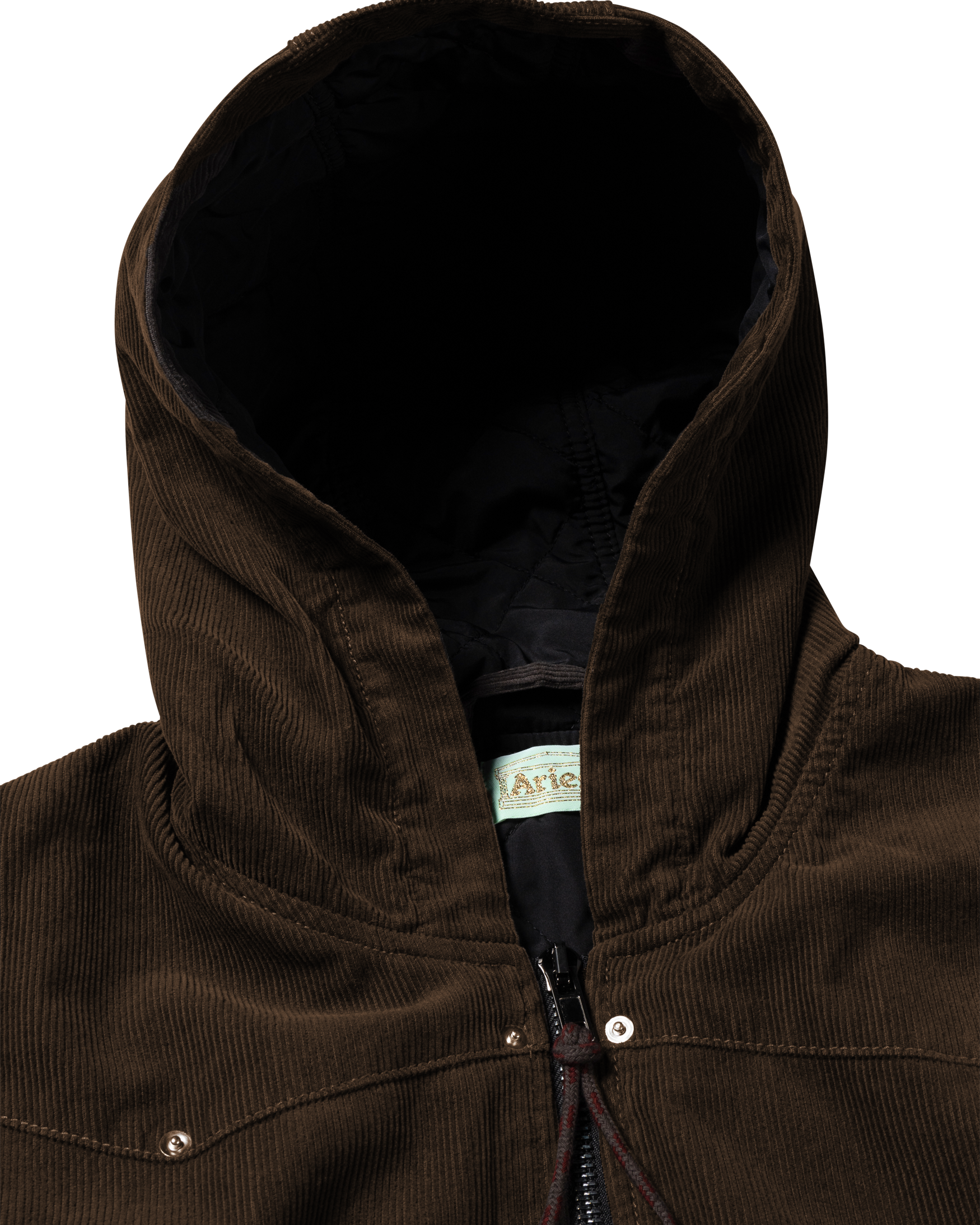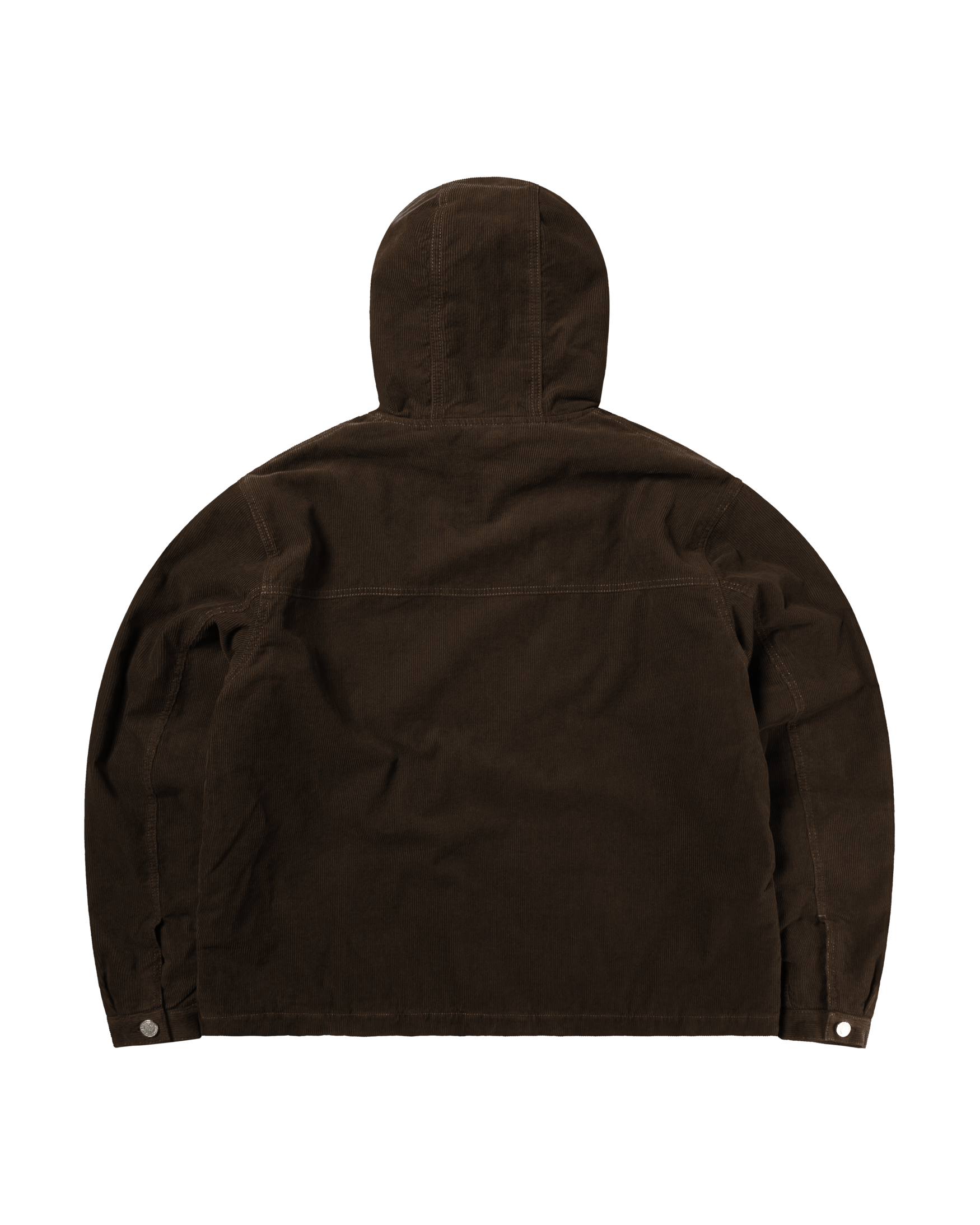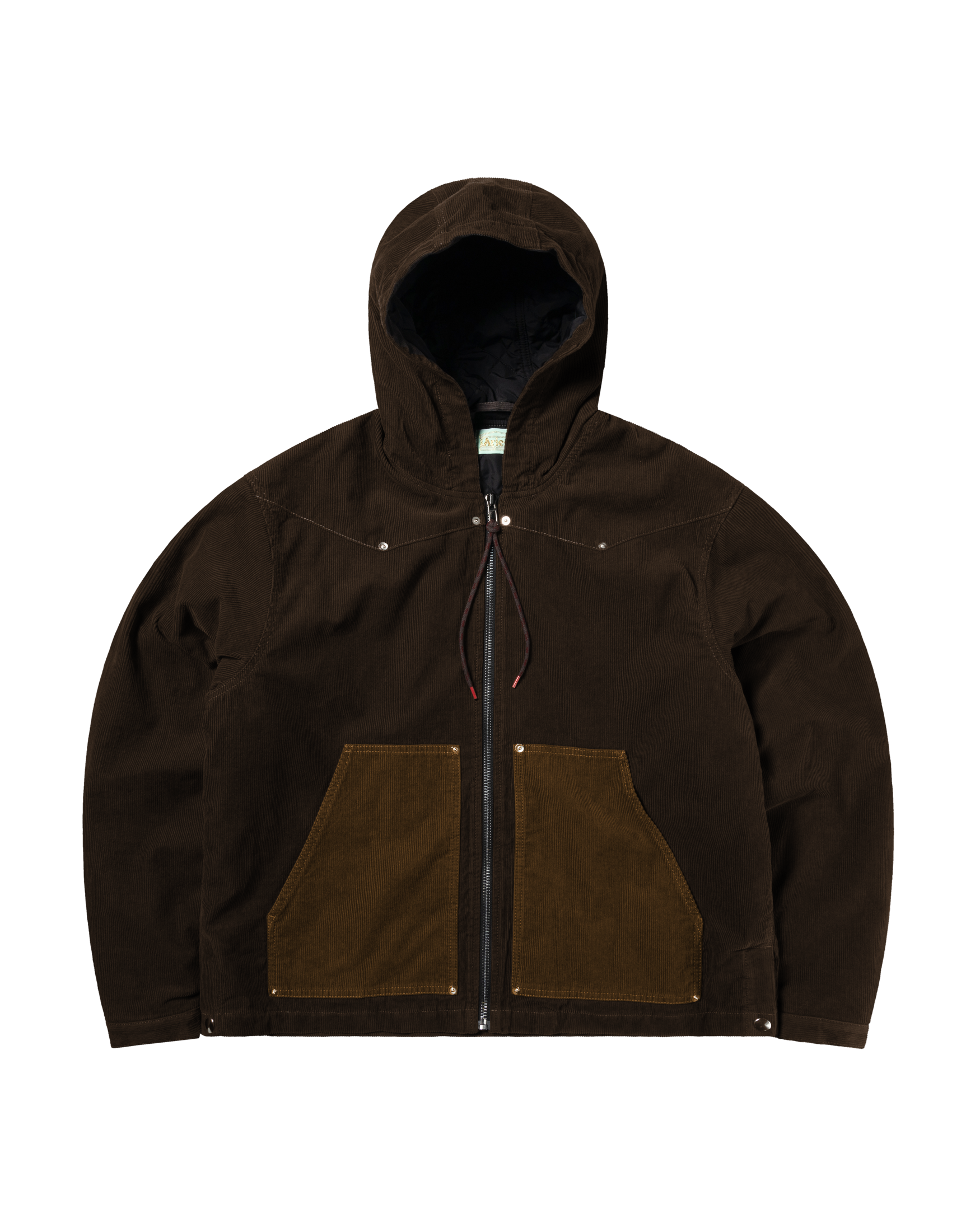 Unisex carpenter hooded jacket with contrast panels, patch pockets on the front and a quilted lining. Made from 100% cotton corduroy, colour blocked and overdyed.