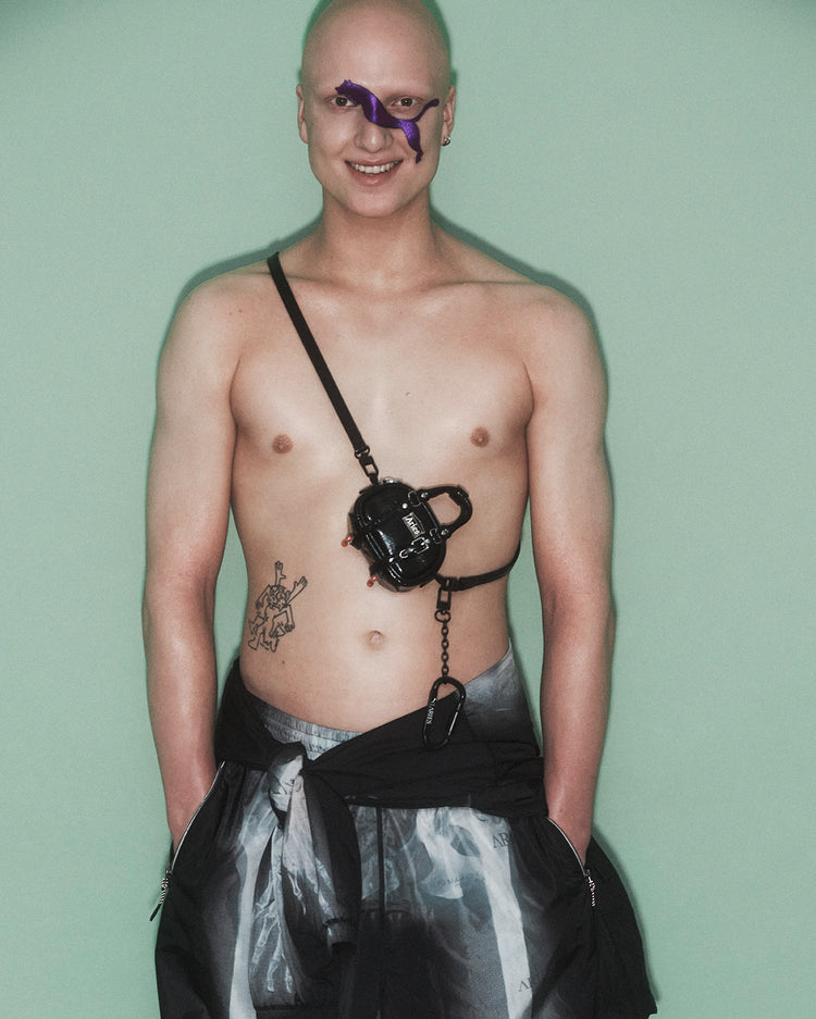 The collaboration capsule includes a moto-mesh long sleeve tee featuring a selection of Aries custom graphics, as well as the knitted cardigan printed with an original digital print.
