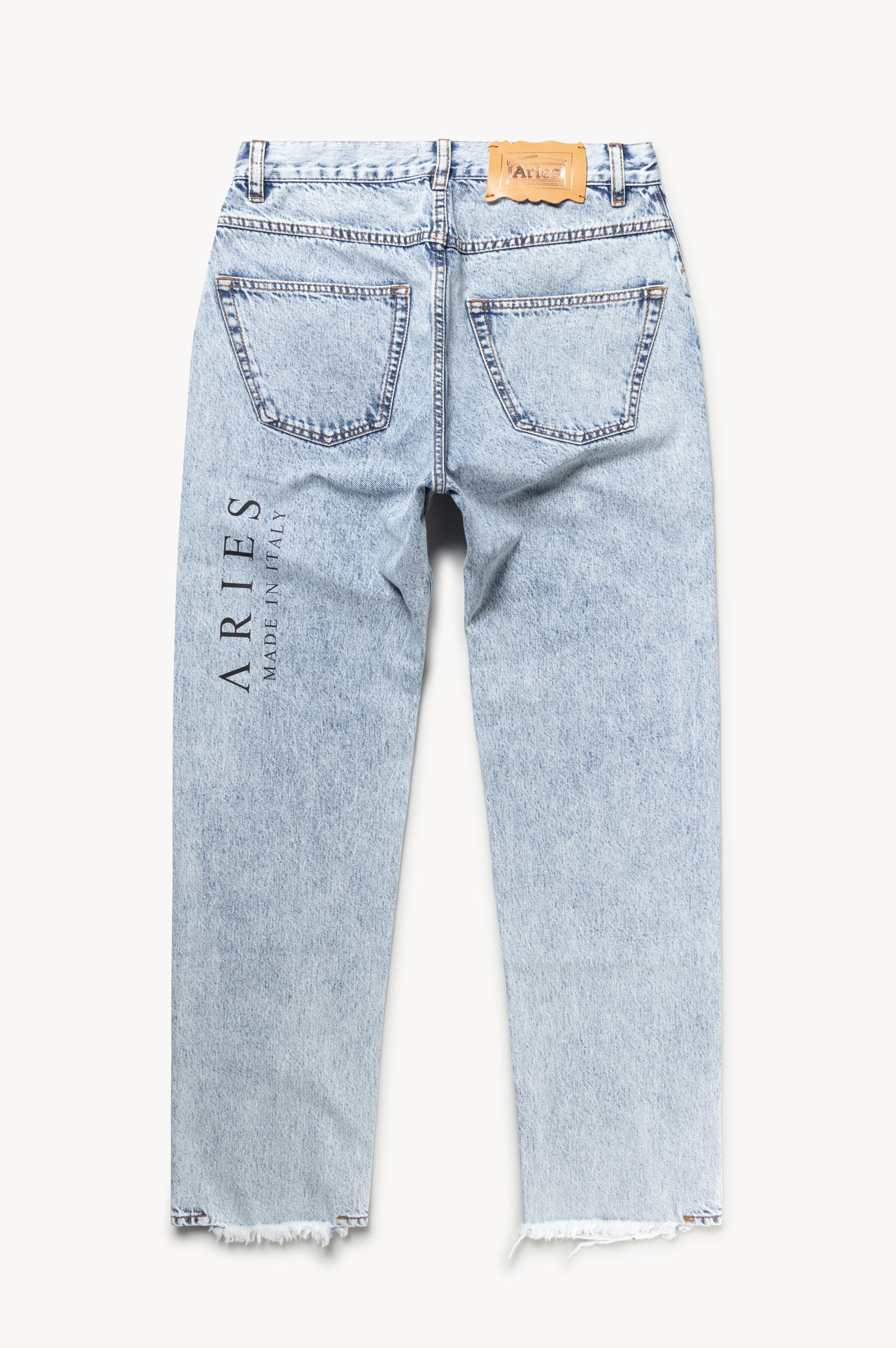 Unisex vintage-cut 90s skate-style jeans made from 100% cotton indigo denim. Treated with a heavy acid wash and with an Aries MIIT screen-printed logo on the back thigh. Meant to be worn super baggy, they come up a size larger than conventional mens' sizing so size down if you prefer a closer fit. Comes in indigo or over-dyed lilac. Made in Italy.