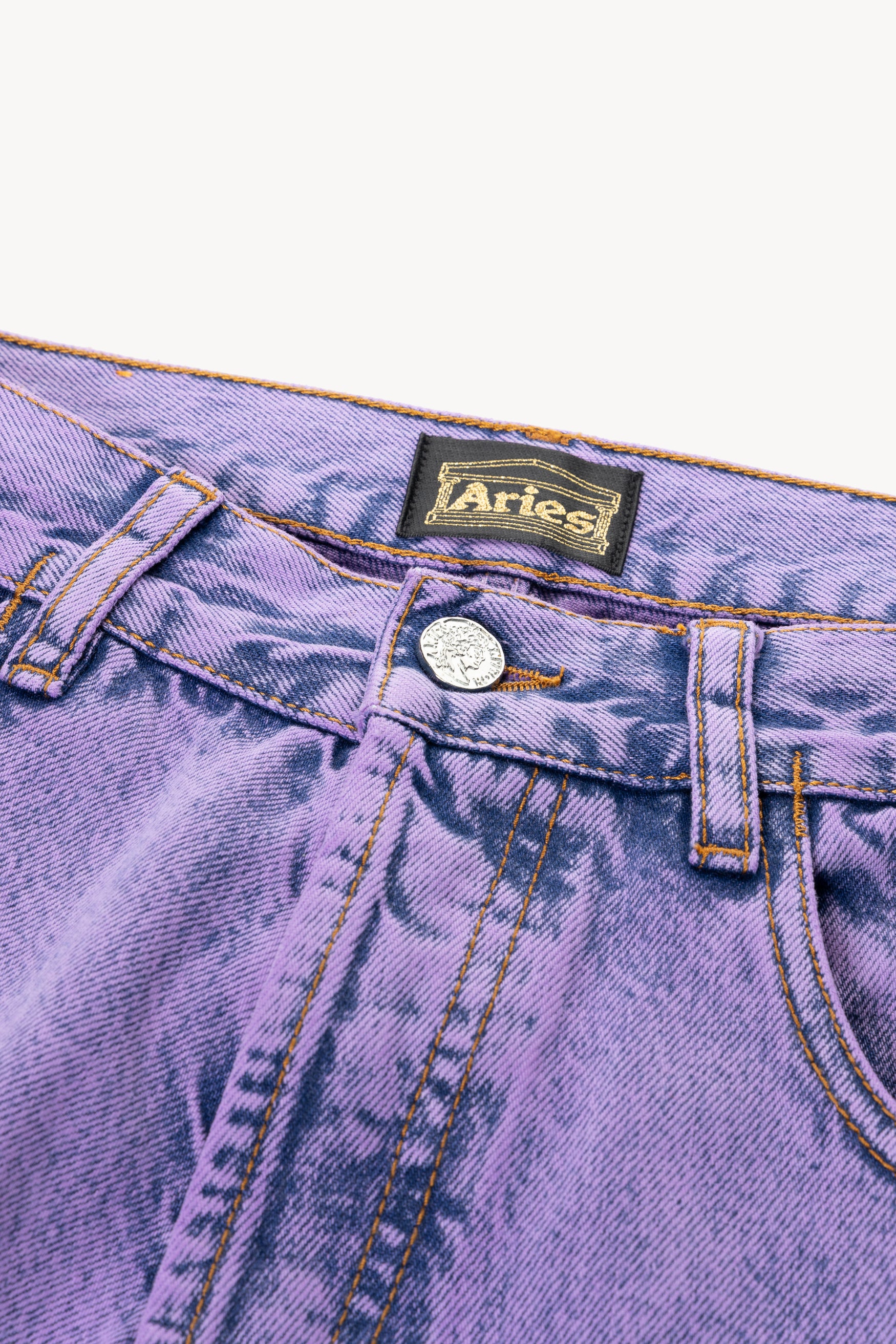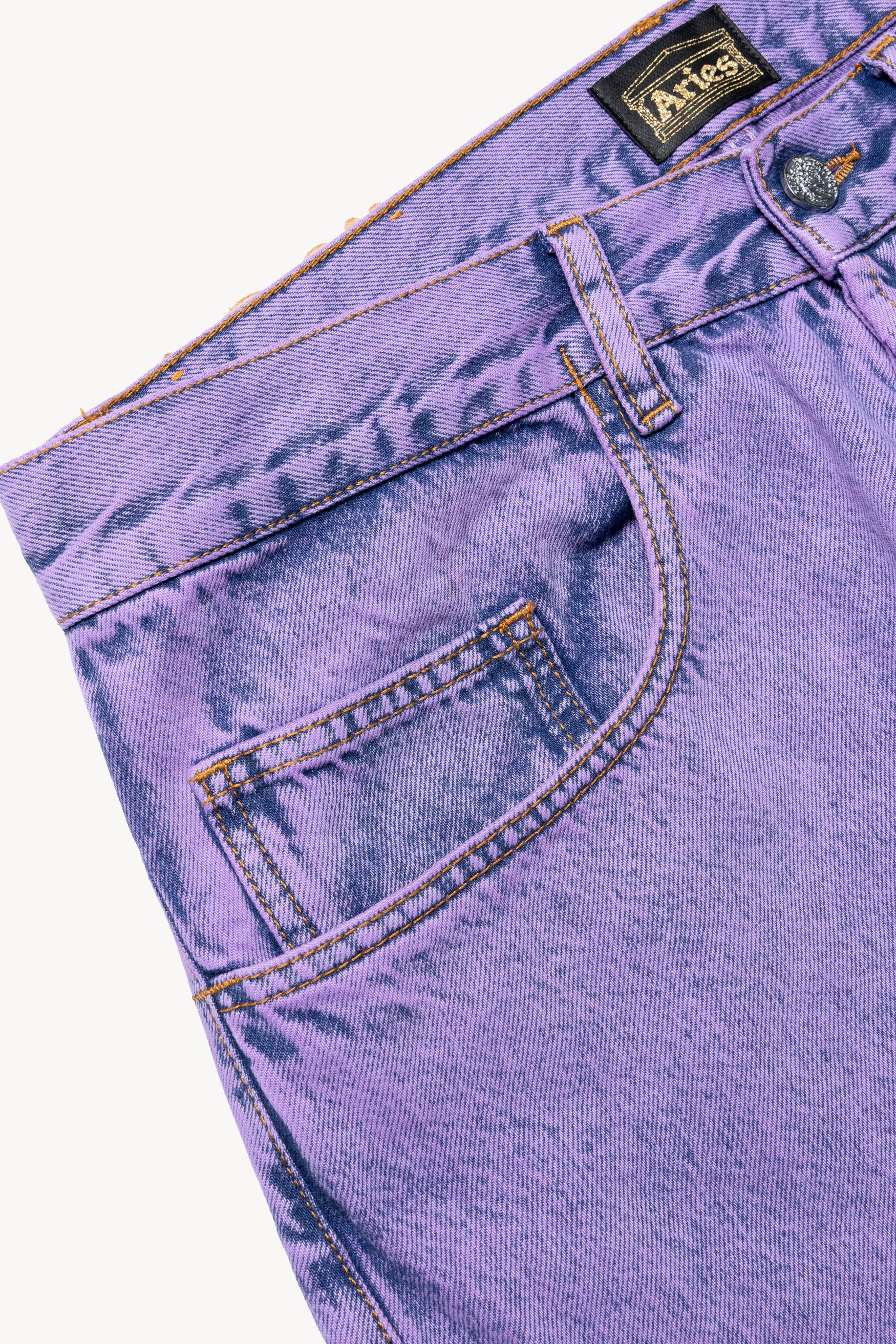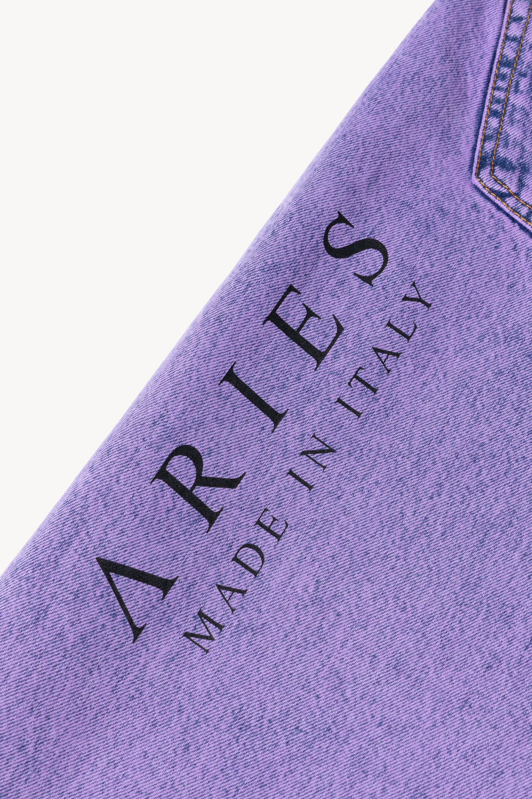 Unisex vintage-cut 90s skate-style jeans made from 100% cotton indigo denim. Treated with a heavy acid wash and with an Aries MIIT screen-printed logo on the back thigh. Meant to be worn super baggy, they come up a size larger than conventional mens' sizing so size down if you prefer a closer fit. Comes in indigo or over-dyed lilac. Made in Italy.