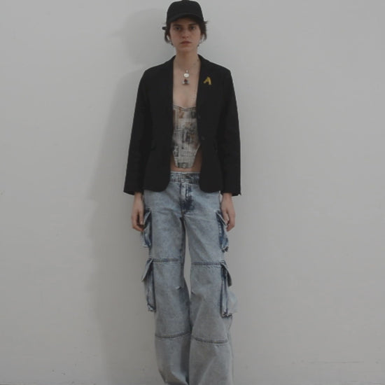 Super low-rise wide leg cargo pant made from 100% cotton indigo denim. With sizeable cargo pockets and elasticated hems so you can wear them wide or cinch them in. Treated with a heavy acid wash. Comes in indigo or over-dyed lilac. Made in Italy.