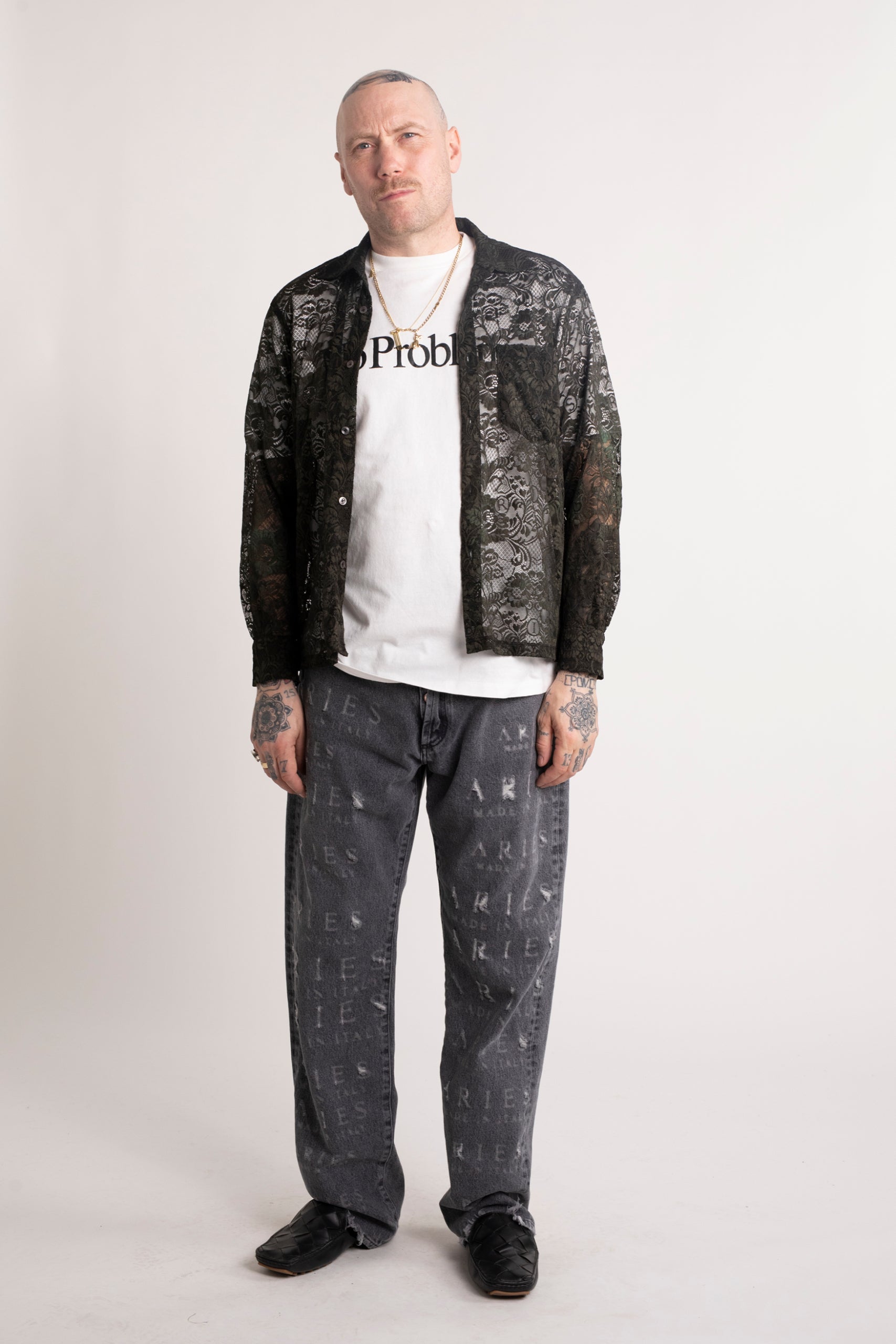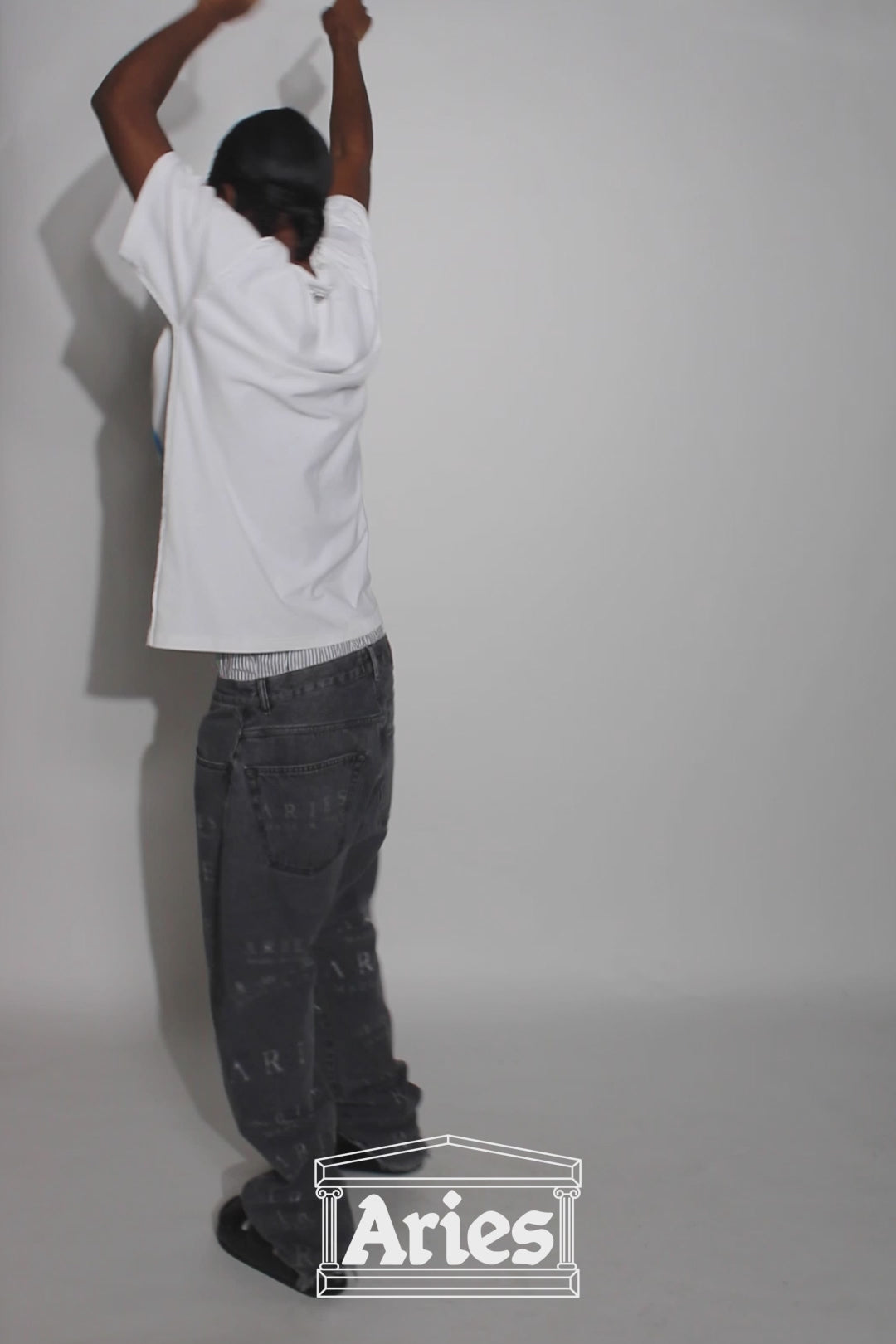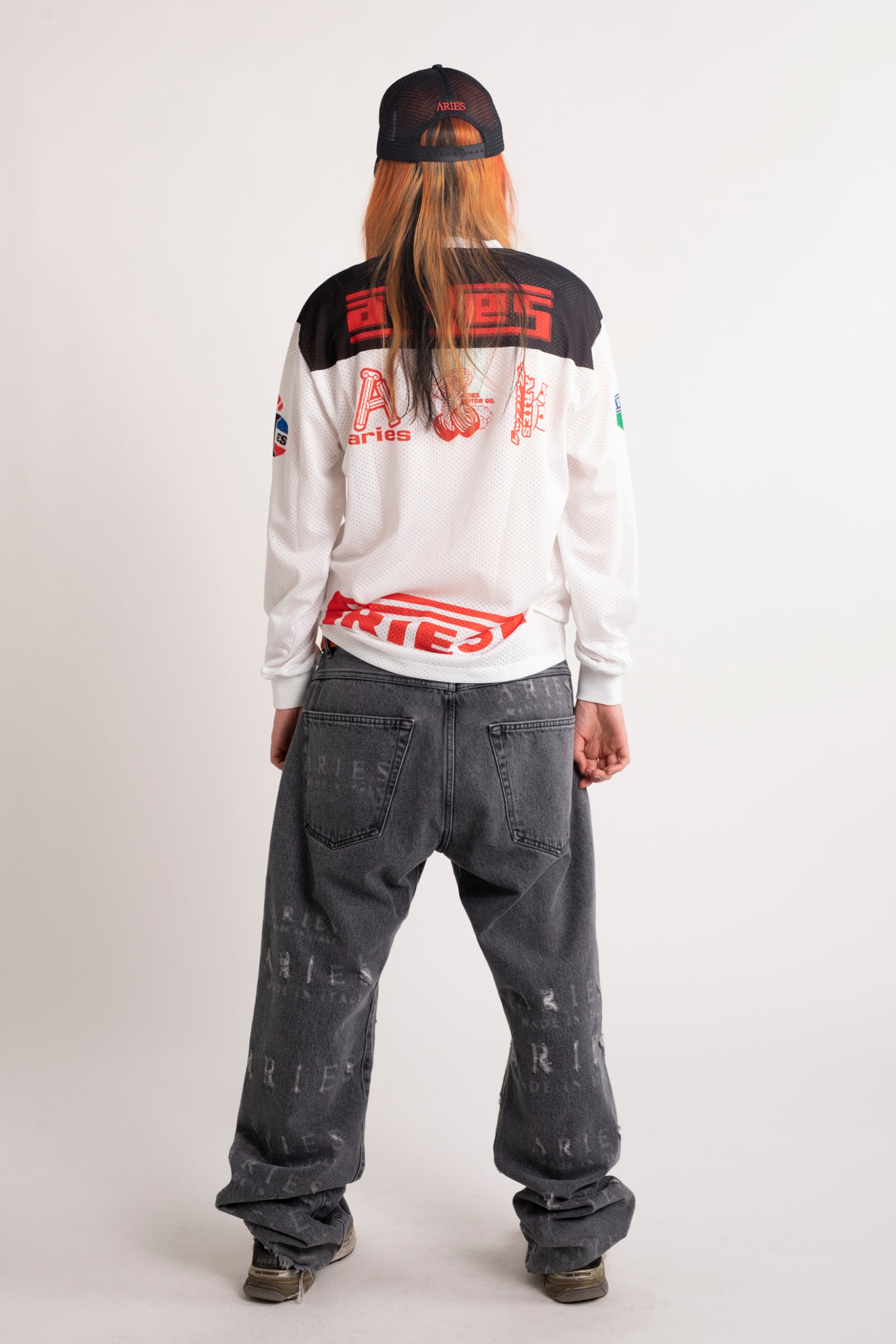 Unisex vintage-cut 90s skate-style jeans made from premium black denim. Heavily lasered allover with destroyed Aries MIIT logos to create intentional rips and holes. Treated with a vintage-style stonewash. Meant to be worn super baggy, they come up a size larger than conventional mens' sizing so size down if you prefer a closer fit. 100% cotton. Made in Italy.