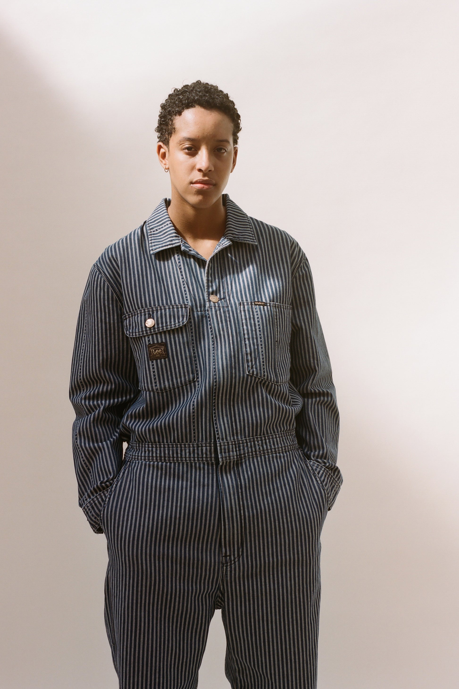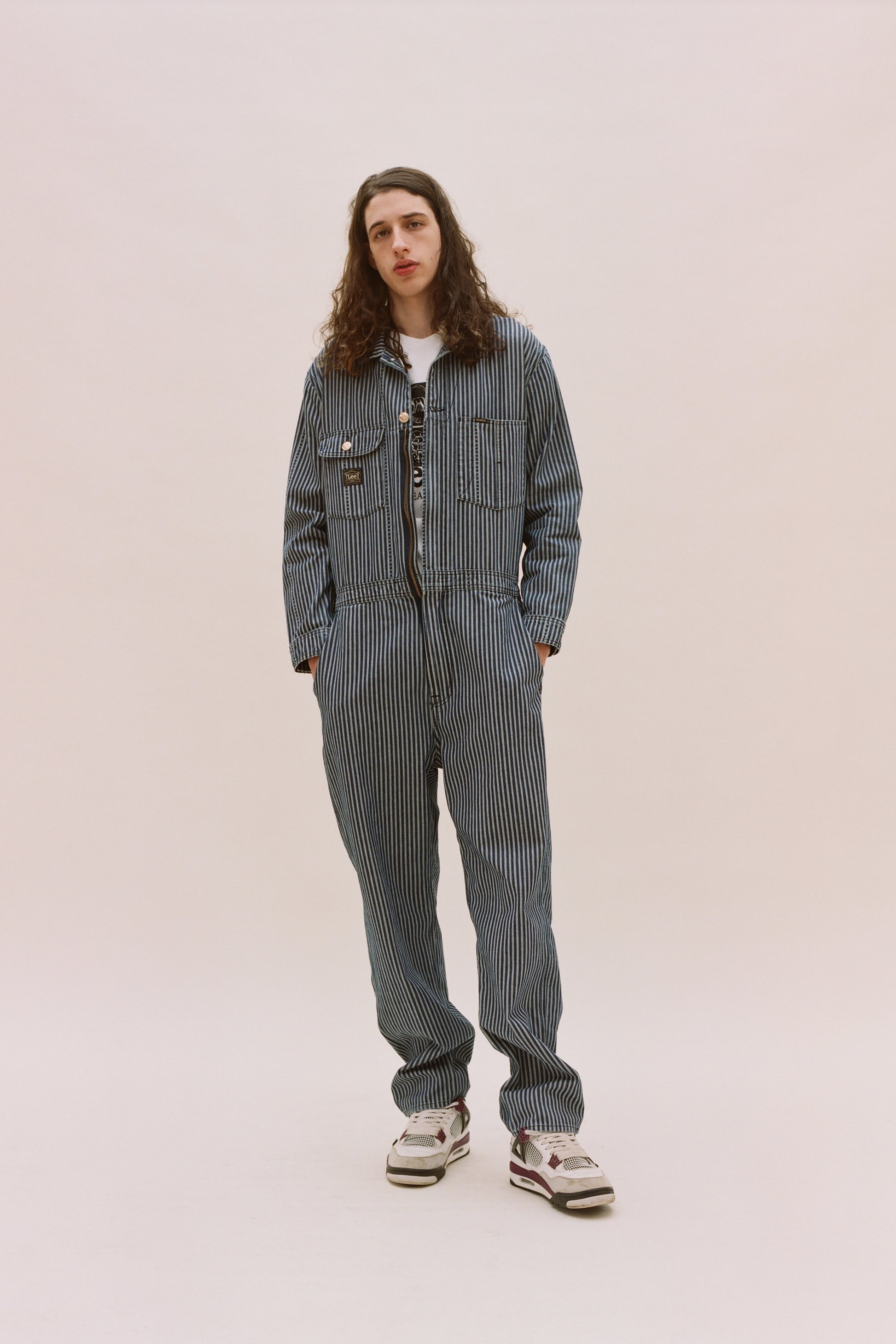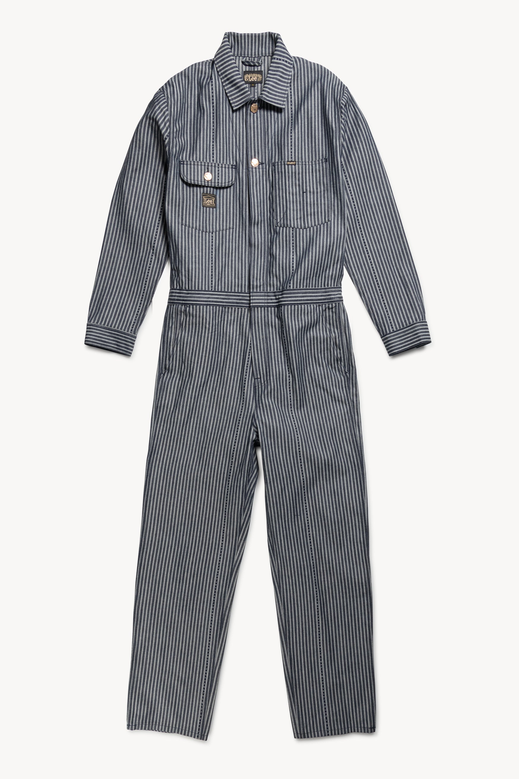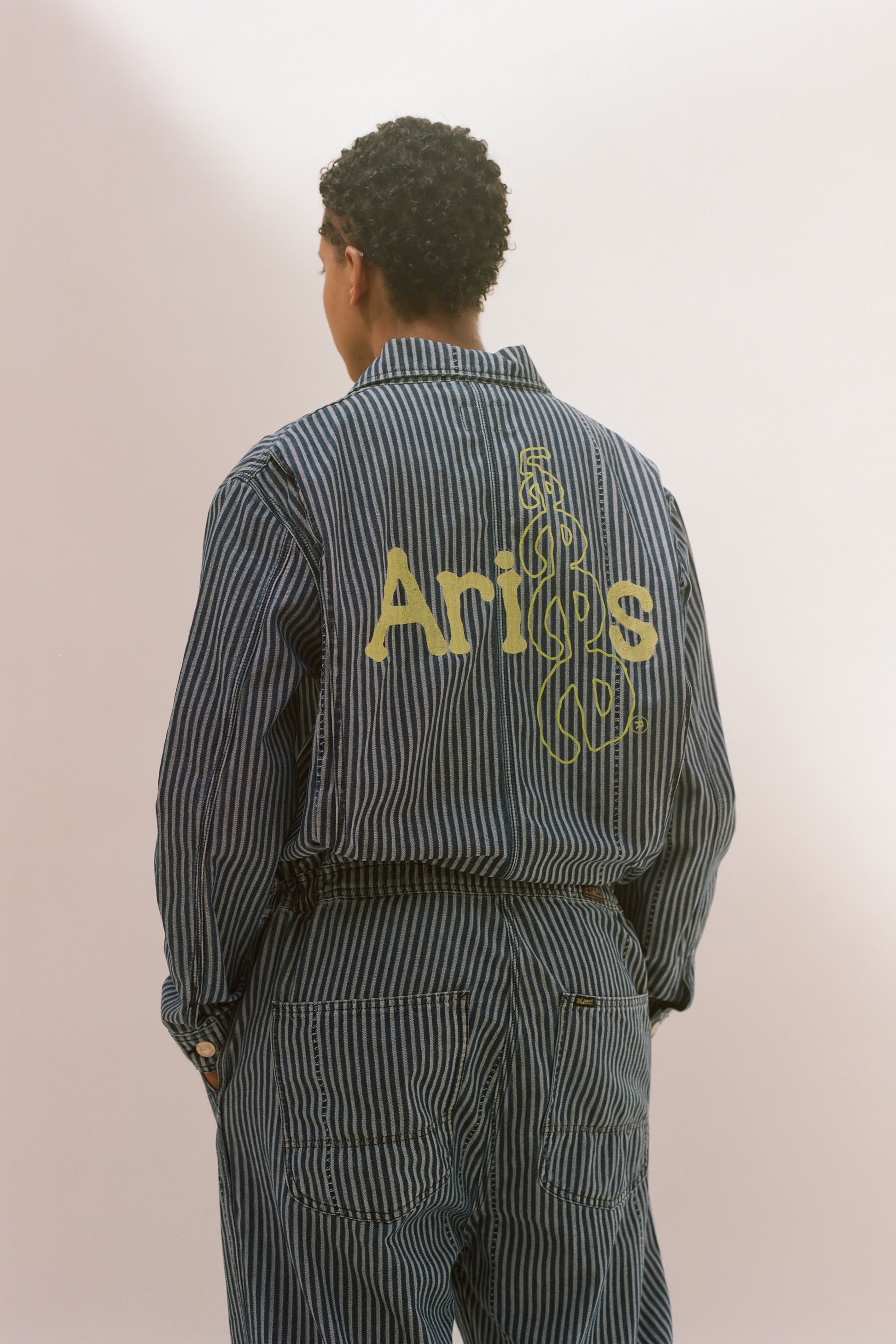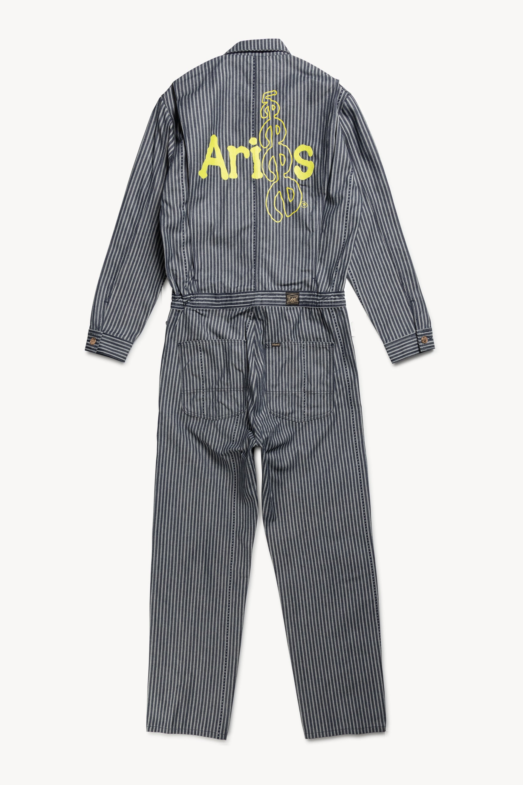 Unisex workwear-inspired Whizit coverall from the Lee archive, re-invented in a custom Aries logo hickory stripe denim. With a Lee x Aries back screen print and woven label to front left breast pocket. Comes in indigo.