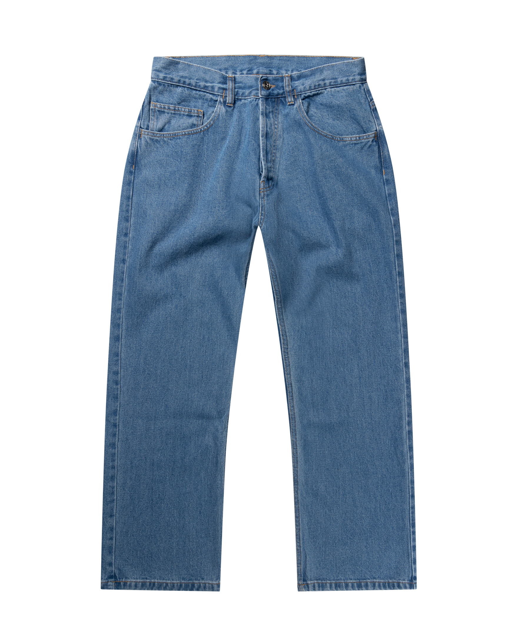 unisex vintage-cut 90s style skate jeans, meant to be worn super baggy made out of 100% cotton blue denim. featuring a no problemo embroidery on the back and alien-o leather patch