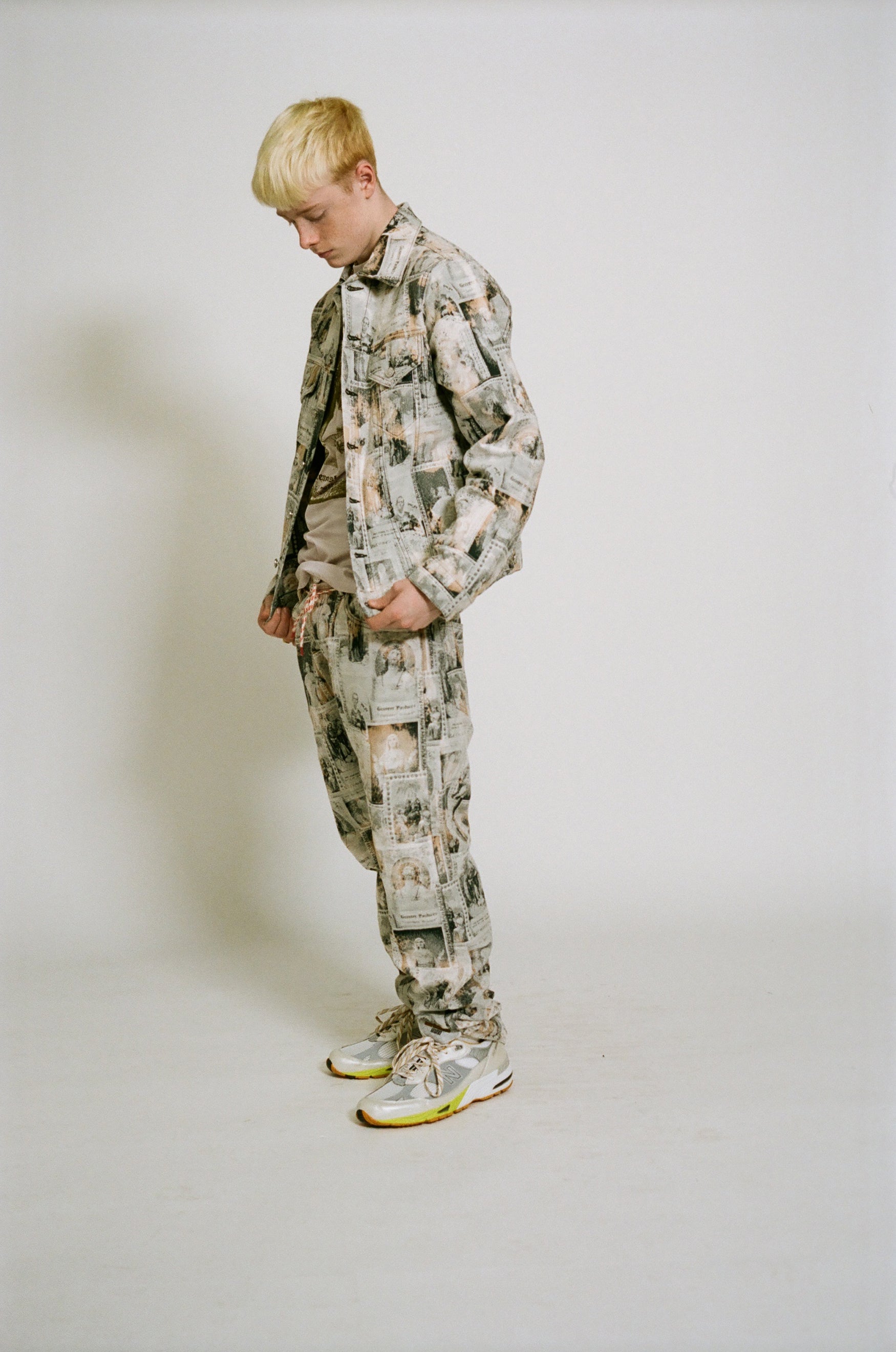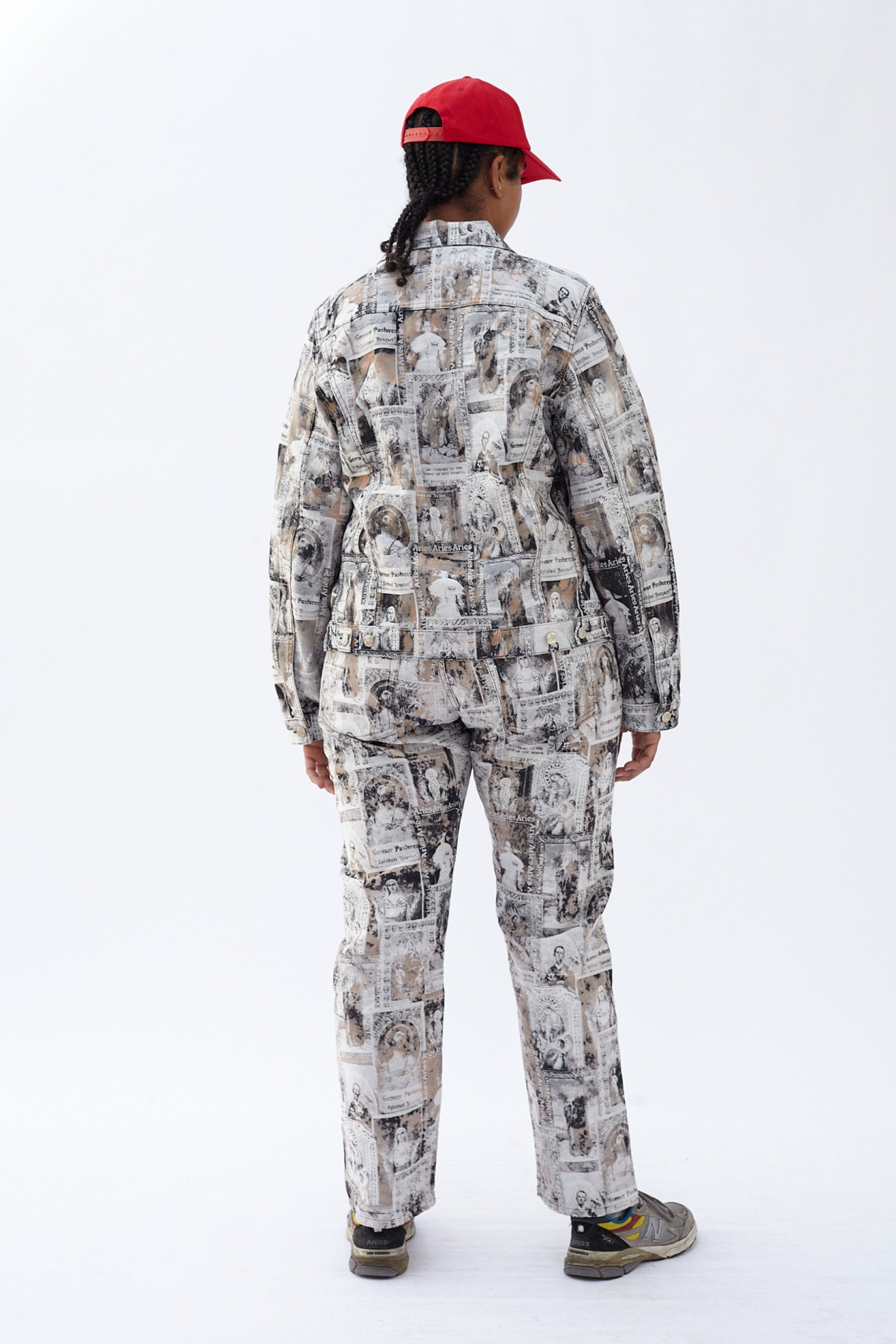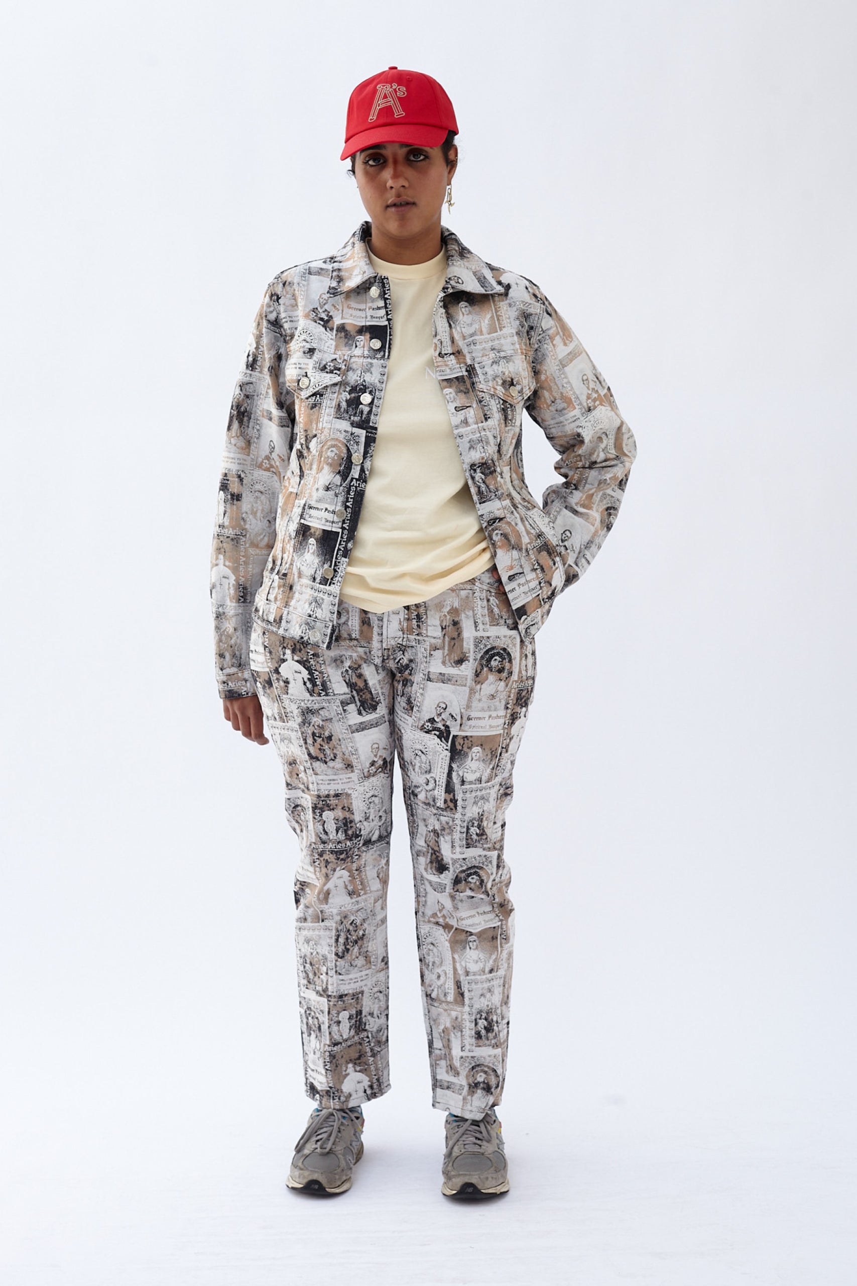 Unisex Lilly jean made from a custom jacquard 100% cotton denim which features an allover saints card design. Our favourite unisex classic-cut jeans that look great tight-fitting or baggy. True straight leg with a high rise and button fly. Sized to conventional men’s sizing. Treated with a patchy acid wash treatment. Made in Italy.