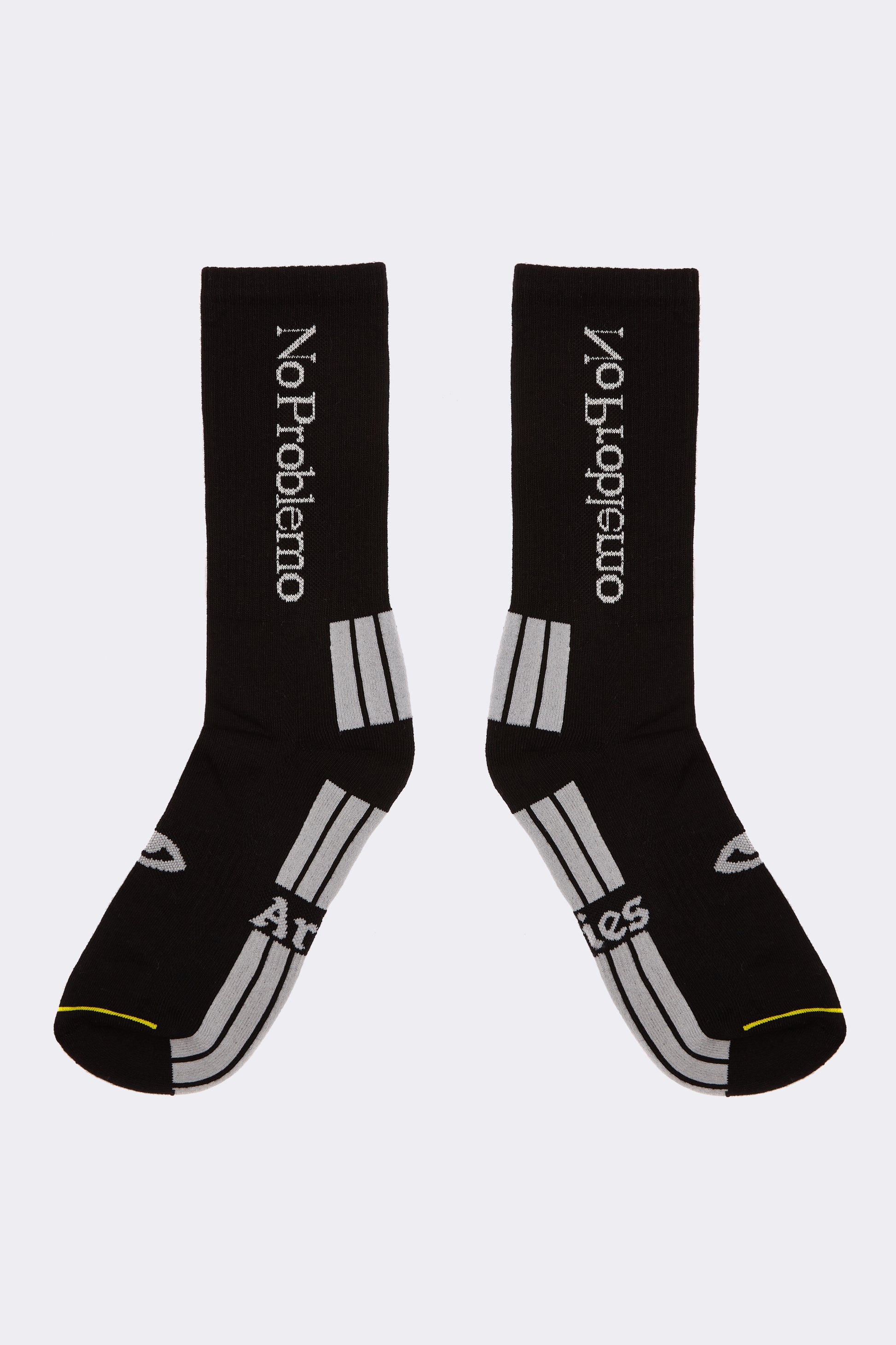 Black sports socks in a cotton/performance fabric blend featuring an array of Aries graphics.