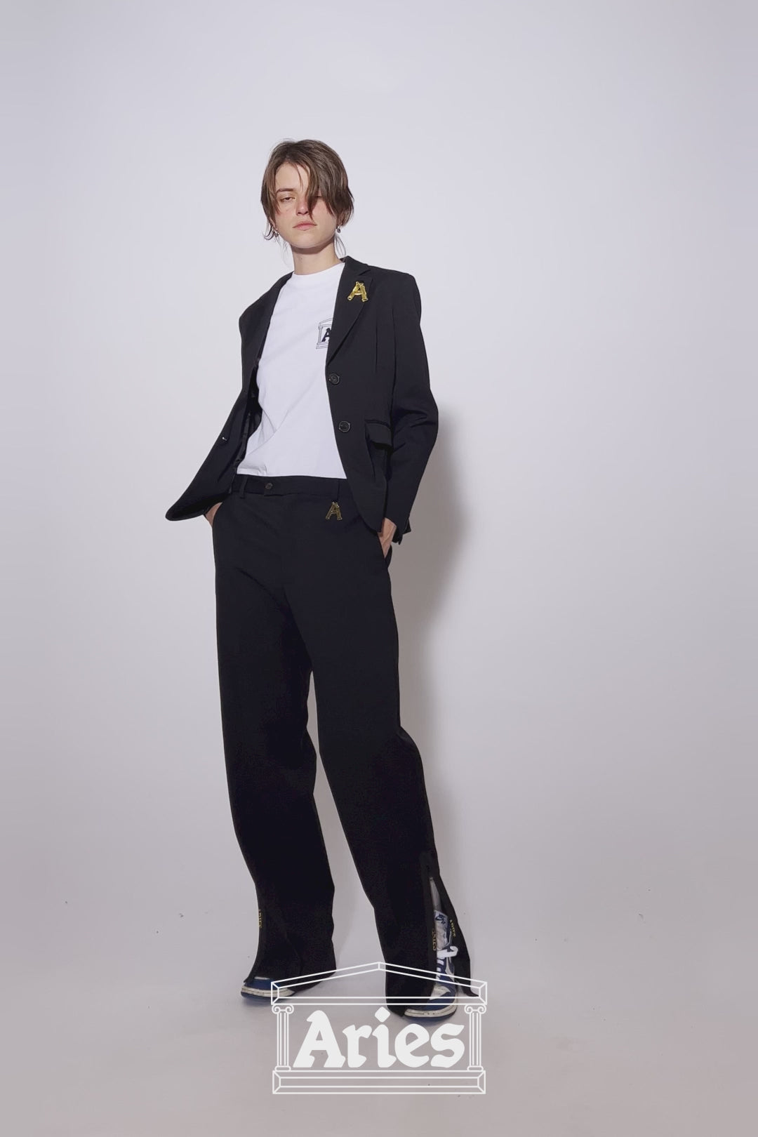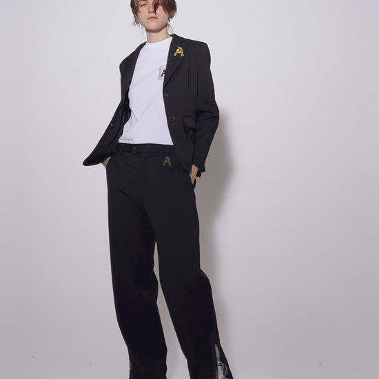 Unisex tailored trousers with herringbone custom logo zips at the ankles, made from a wool-blend cloth. With a straight leg and tailored waistband. Made in Italy.