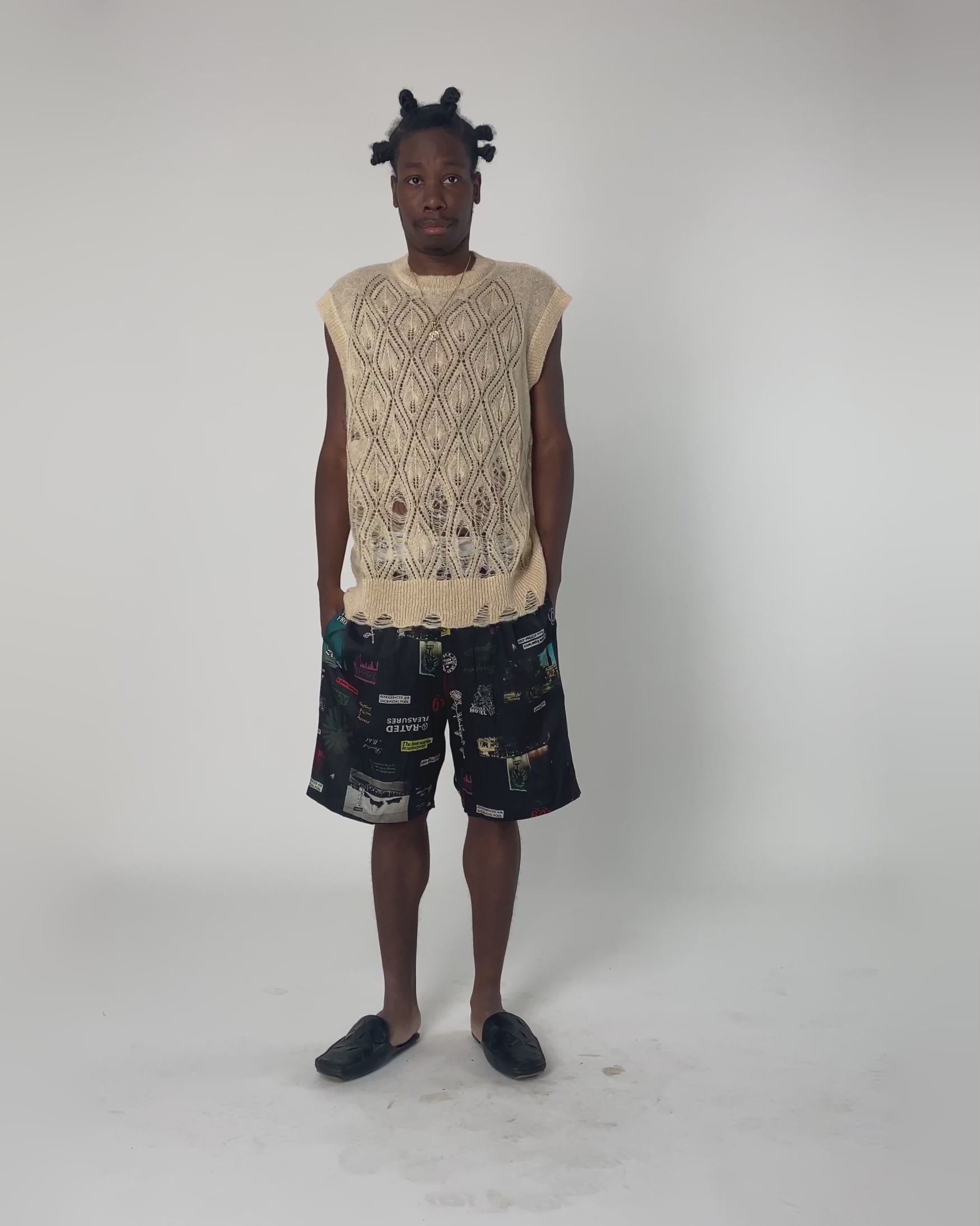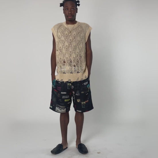 Crewneck vest knitted from a mohair-blend yarn. With a knitted lace leaf and laddered cable design.