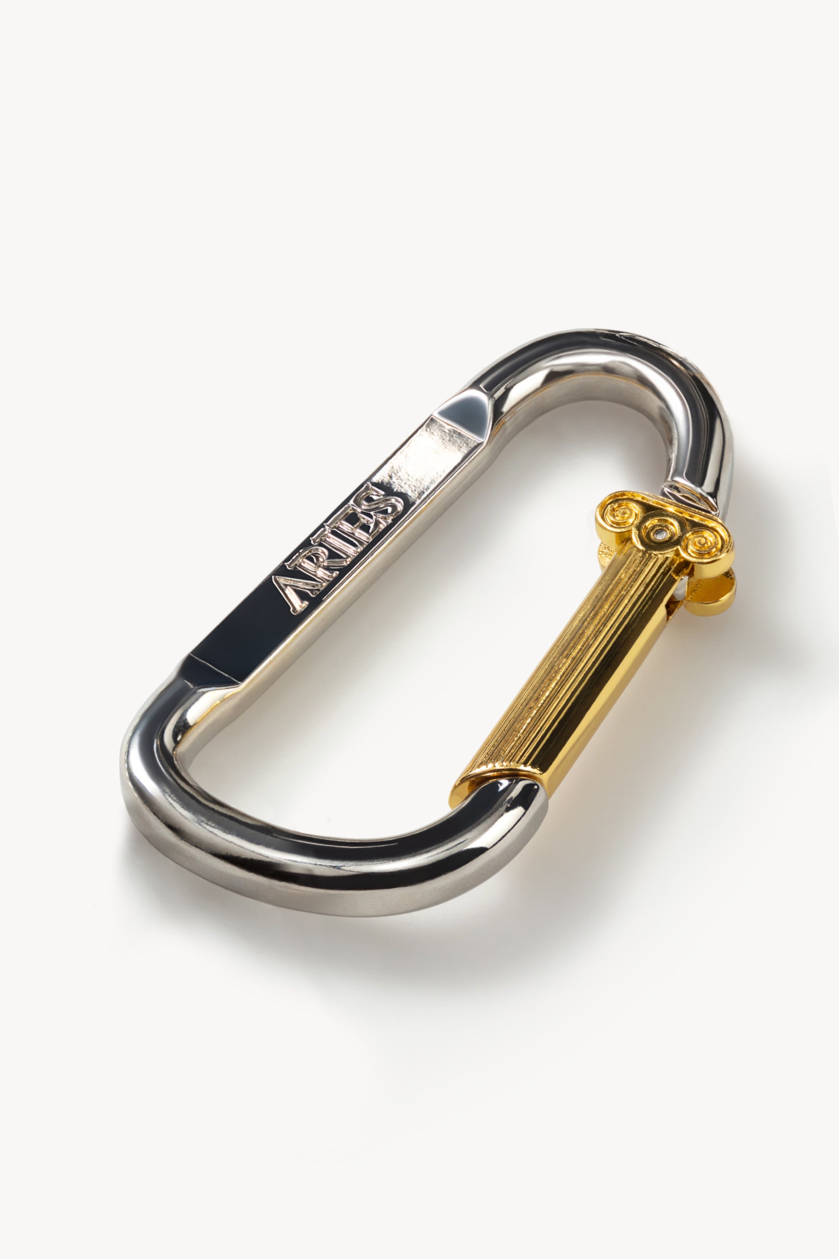 Moulded brass - Silver and gold plated with moulded Aries carabiner as the clip - not for climbing.