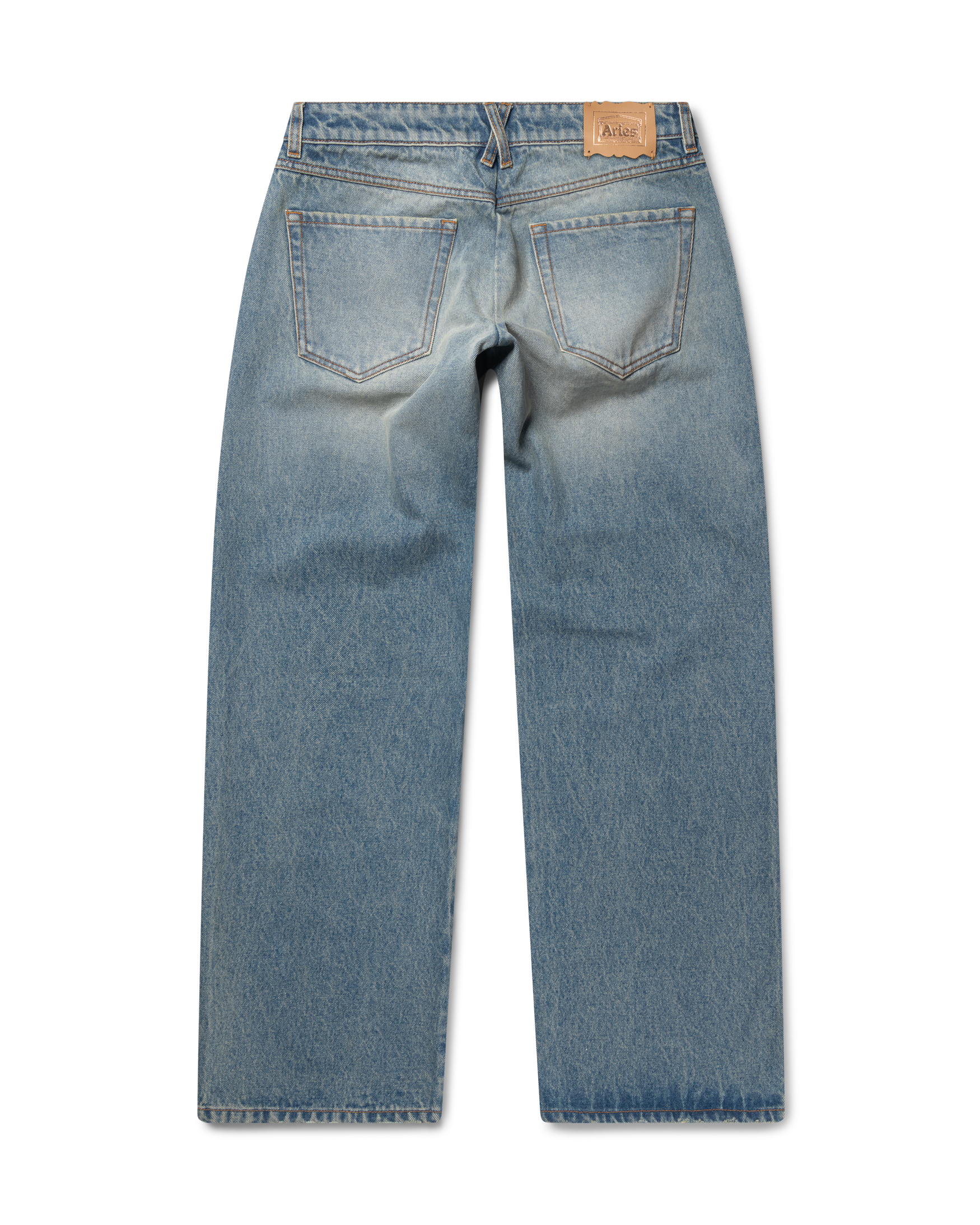 Unisex five pocket wide leg jean made from 100% cotton denim with vintage distressed wash, a dirty tint overdye and a leather temple patch.