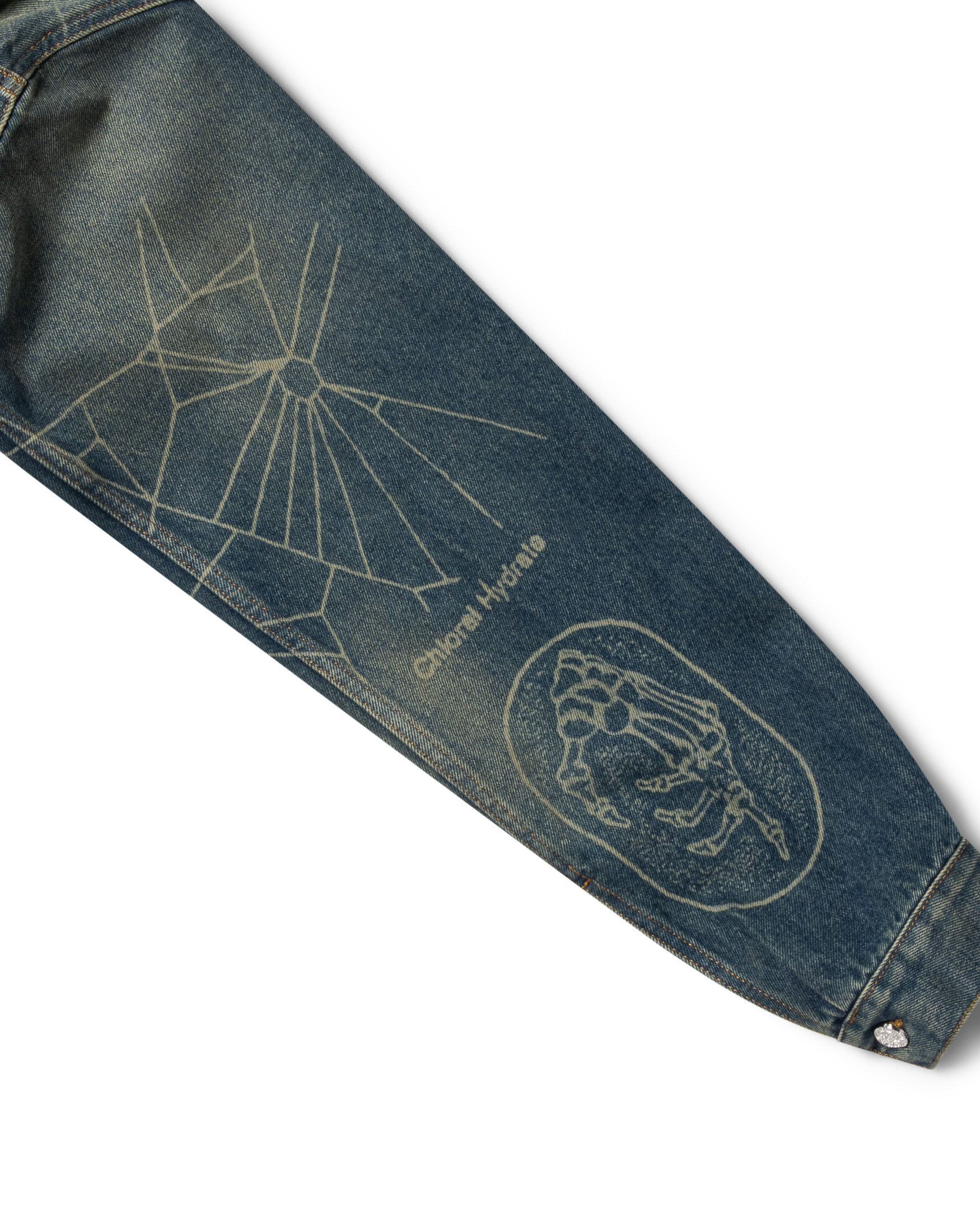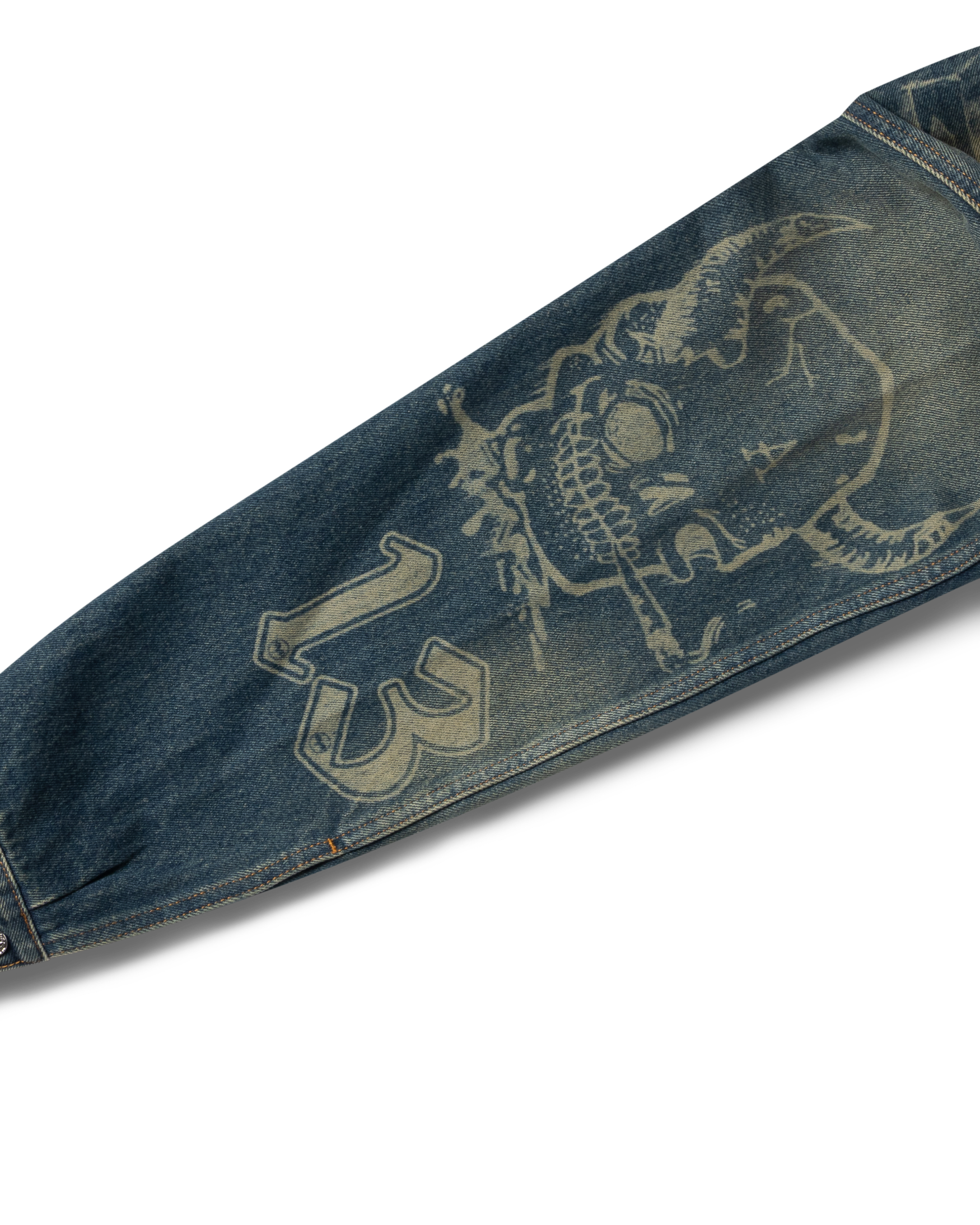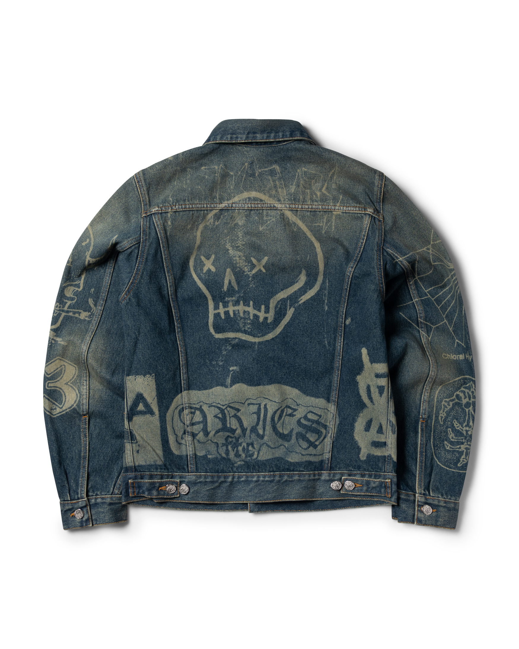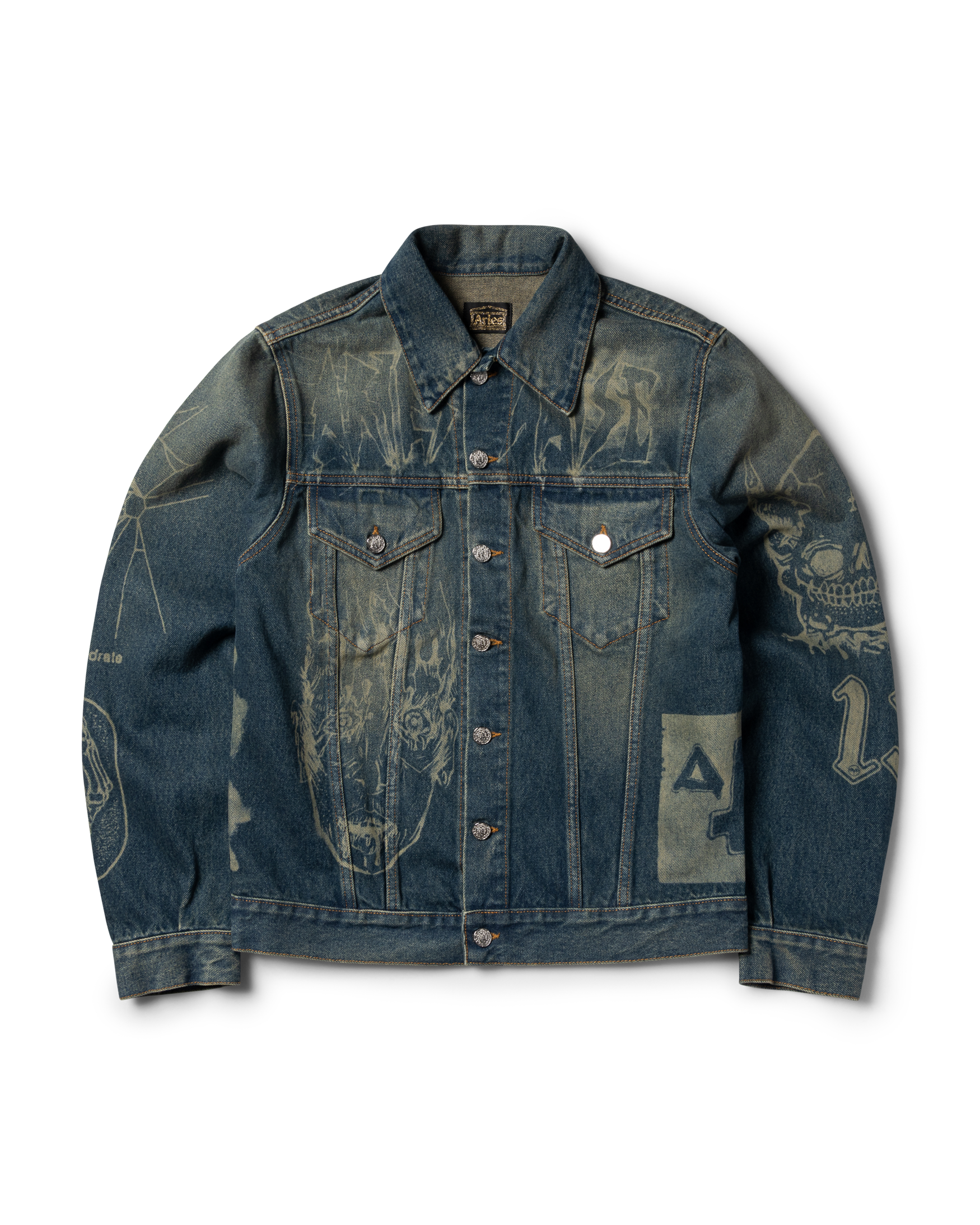 Unisex denim trucker jacket. Made out of 100% cotton denim with all over Aries Metal lasered graphics and a 00's vintage wash. Roman Coin Buttons. Nice.