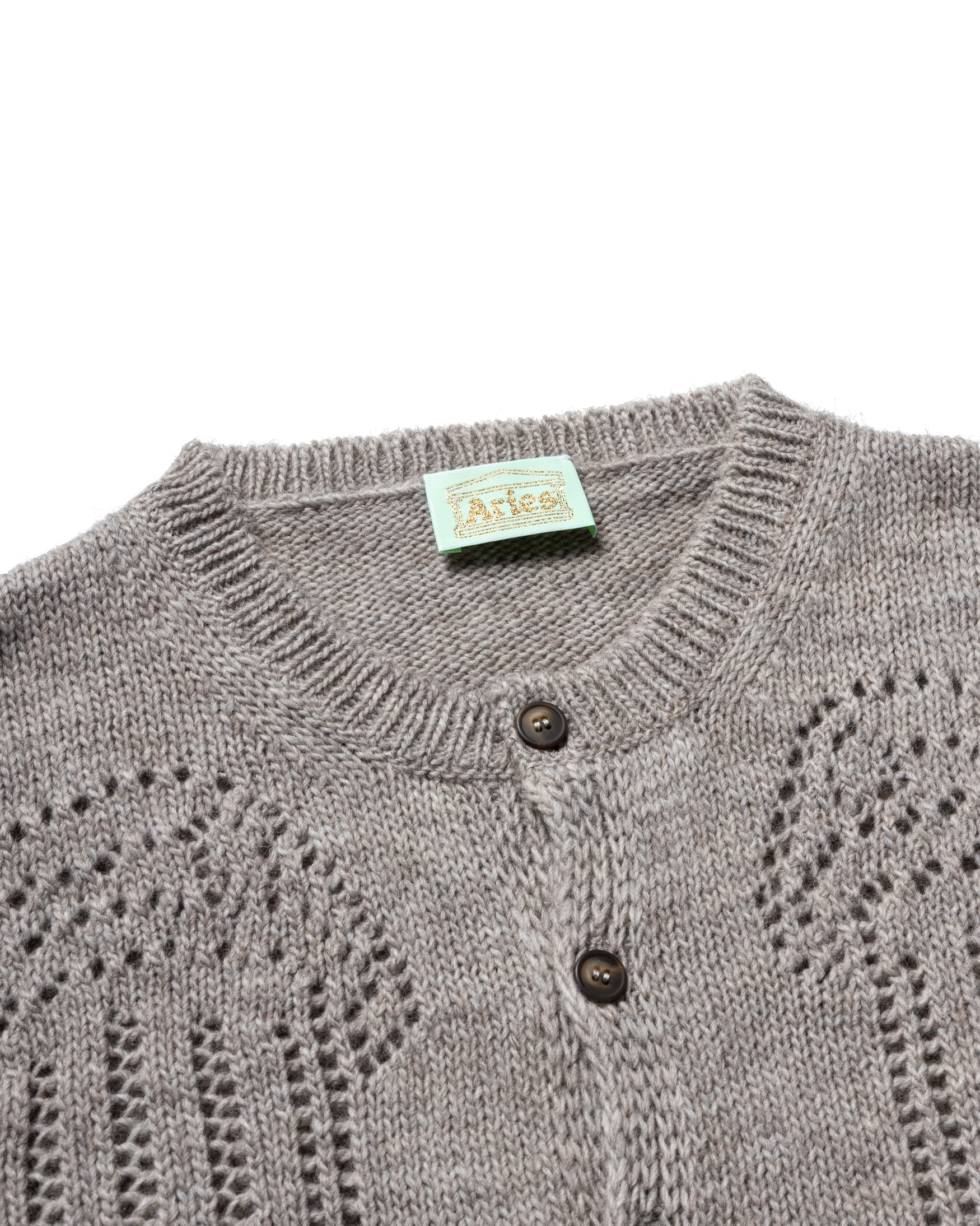 Unisex knitted cardigan in a pointelle stitch with classic Column graphics also in pointelle stitches.