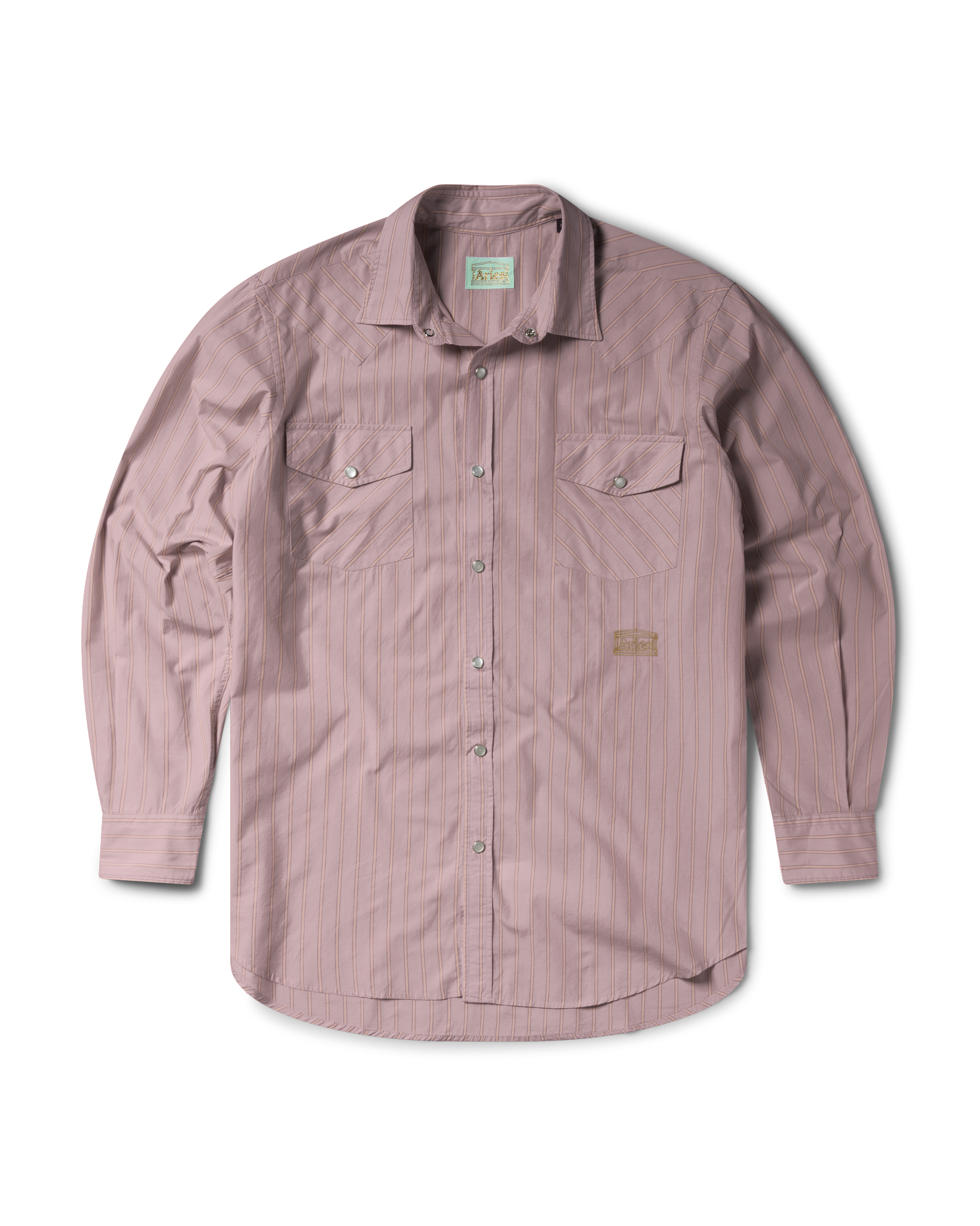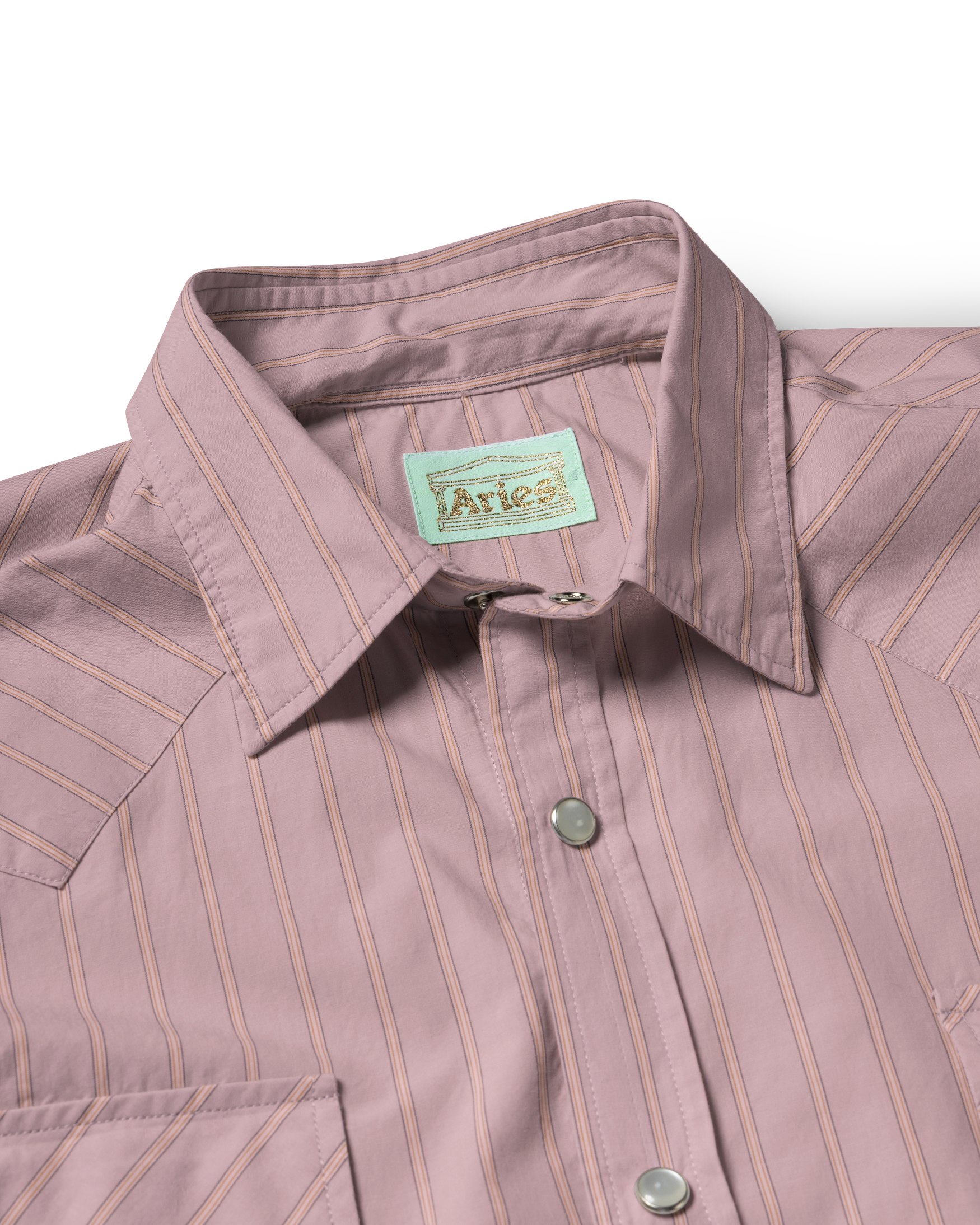 Long-sleeved shirt with western detailing and chest pockets in a striped poplin cotton with embroidered Aries Temple logo under the left pocket.